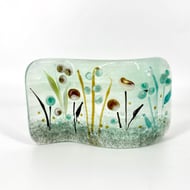 Delicate flowers with sparkly dichroic elements and a spray of delicate lamp worked foliage.