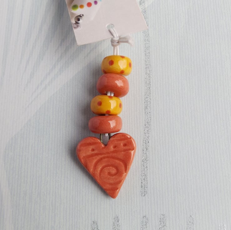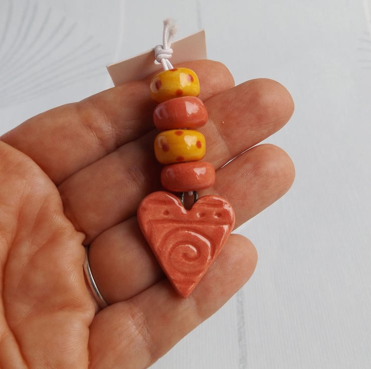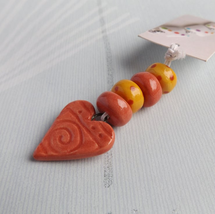 Warm Yellow & Terracotta Red Handmade Ceramic Bead set with textured heart pendant