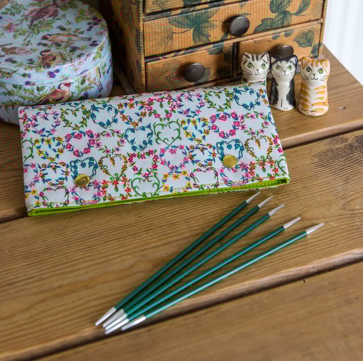 I offer the cosy in two sizes for 8" or 6" needles and another option to add a 3rd snap to the 8" size so that it can be used with circular needles, if magic loop is your thing. You can see how this works in the last photo - essentially, you put your tips together into the left of the cosy, the cable sits to the right, above the right hand snap, and you push another loop of the cable around the extra snap to secure it.