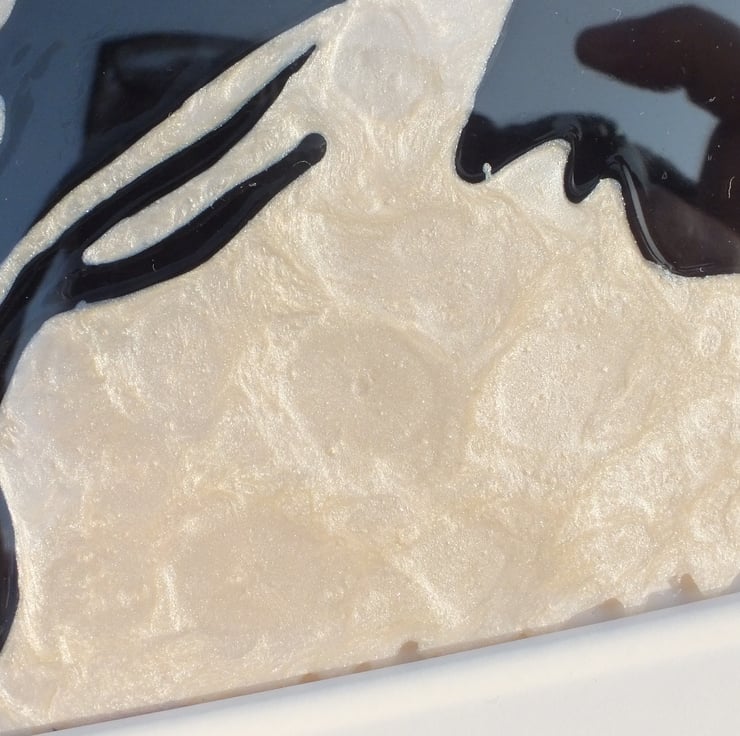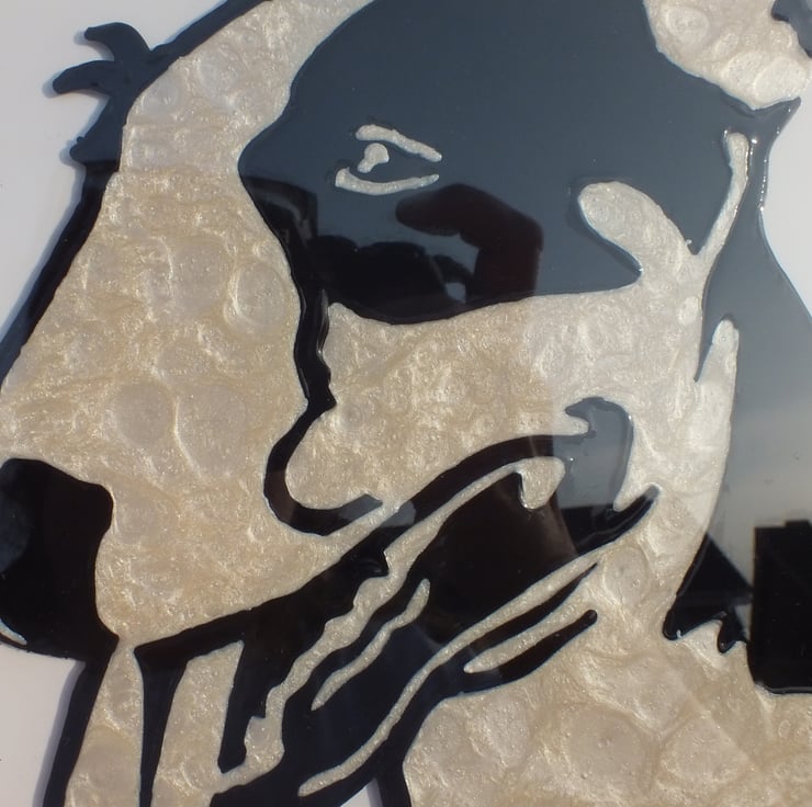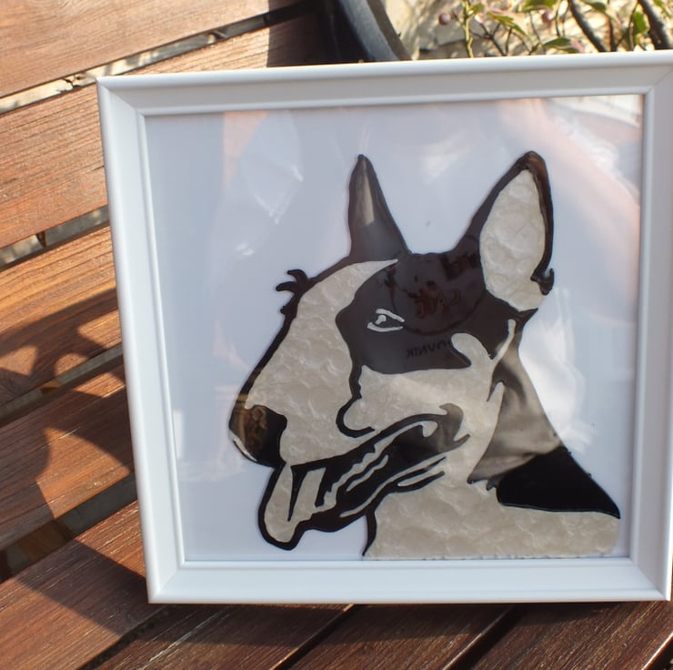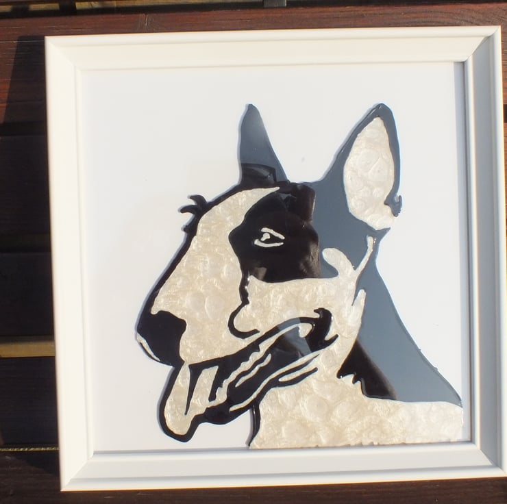I have painted the design on clear acrylic using glass paints - glossy black and a textured look pearl white. I have painted the little dog in a stained glass style and this gives it a slight 3D effect. A back board of glossy bright white acrylic makes the painting pop. I have put a piece of very thin acrylic in front of the painting to protect it.