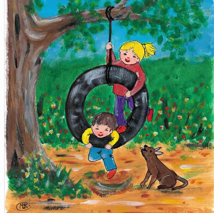 This colourful naive painting in acrylic paints may inspire children to tell their own story about what they see on the canvas. The Summer is a fantastic time for children to play and explore. Here are children playing on on old tire, made into a swing by dad.