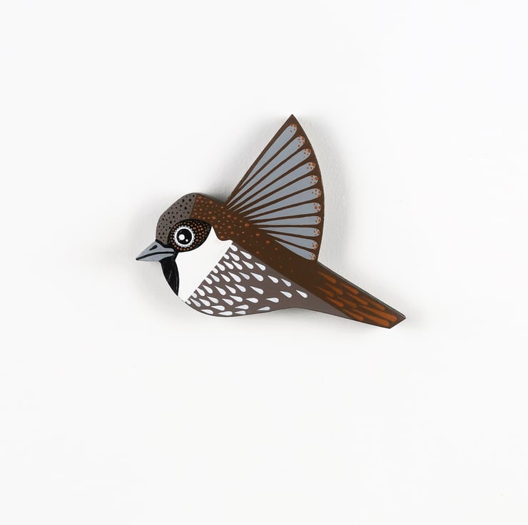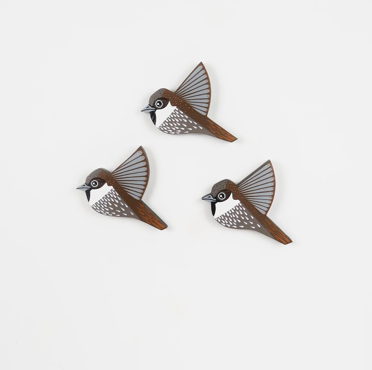 House sparrow wall hanging, set of 3 miniature flying birds, wooden decorations.