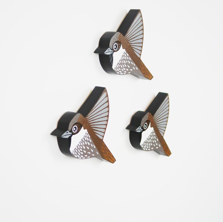 Beautiful wooden HOUSE SPARROW wall decoration. Set of 3 little birds.