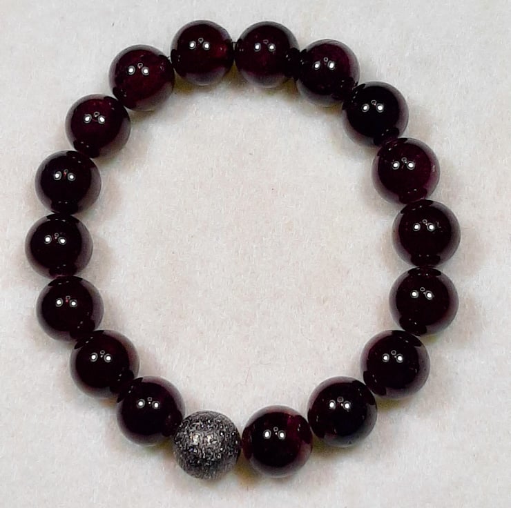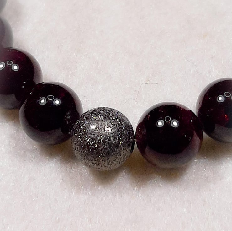 It's made with genuine gemstones - large 10mm Garnet beads,and a focal 10mm dark grey/charcoal Metal Stardust subtle sparkled bead.The Garnet is a deep, pretty, wine red colour.