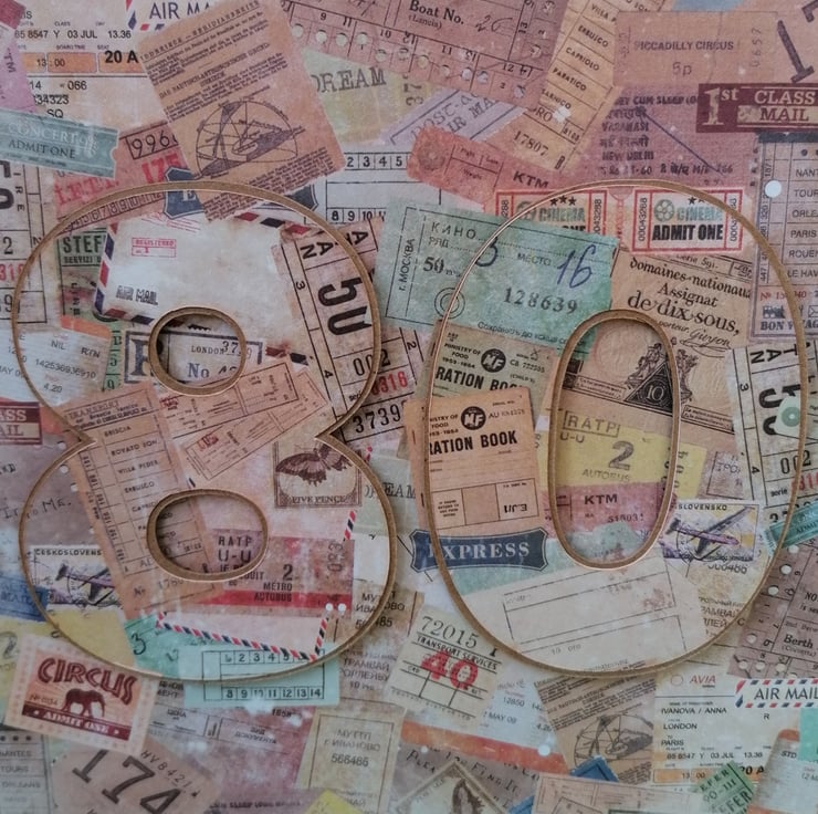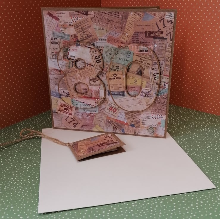 Ephemera collage paper on a kraft card base. 80 is pattern matched to background paper, raised and has a fine border.