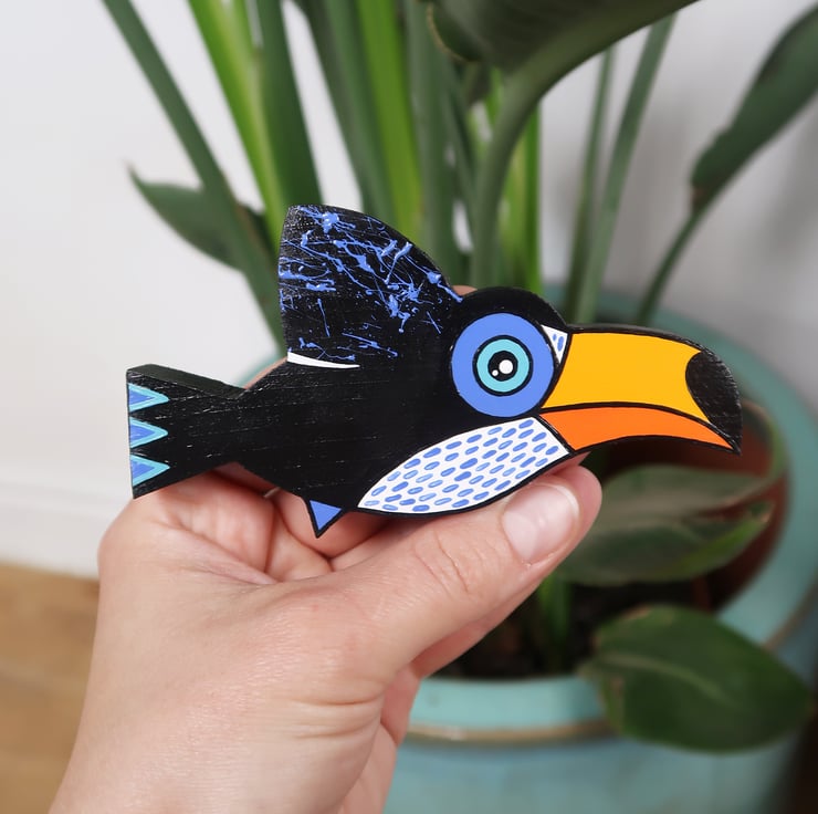 Wooden toucan wall hanging, hand painted tropical bird art.