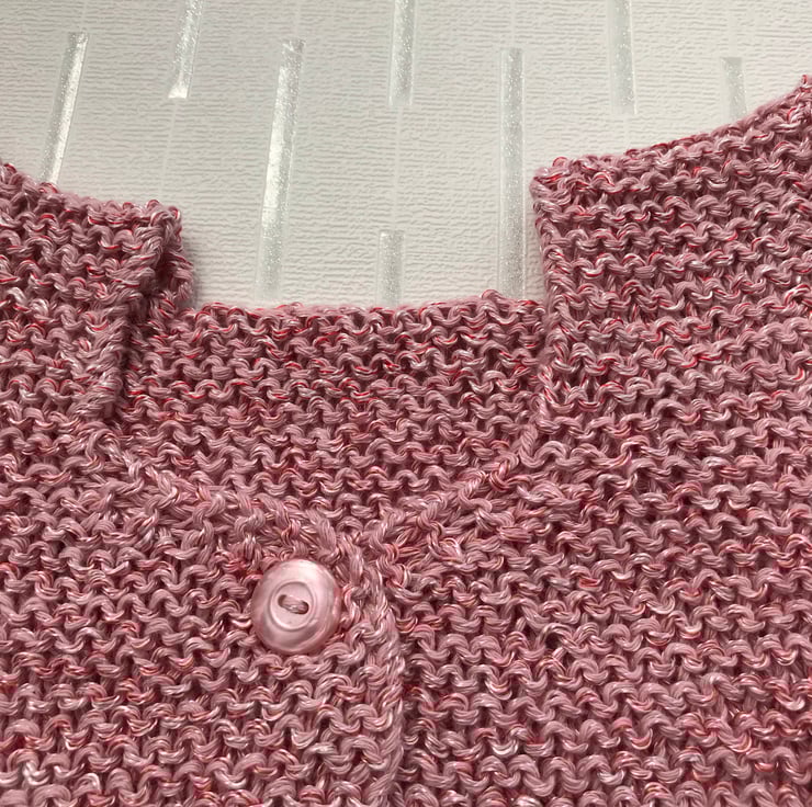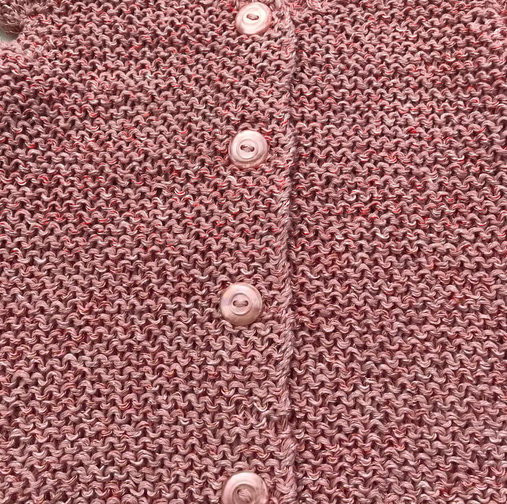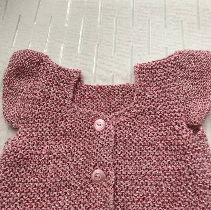 A hand knitted cap sleeve cardigan worked in a cotton and polyester yarn. The polyester adds a sheen and sparkle to it. The cardigan fastens at the front with four pink pearly buttons. The neckline at the back is square and at the front features a sweetheart neck.