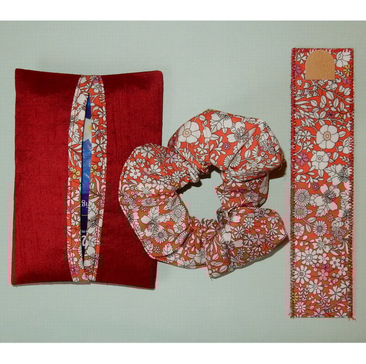 This matching set of silk tissue holder, emery board in case and scrunchy, would cheer up any pampering session. It would look so pretty on a dressing table or will fit beautifully in your handbag. The tissue holder (complete with tissues) is made from silk with a Liberty print binding to match the emery board case and scrunchy. The tissue holder is interfaced for softness and strength. The emery board case is stiffened and has a red stitch trim. The scrunchy is made from the matching Liberty print fabric.