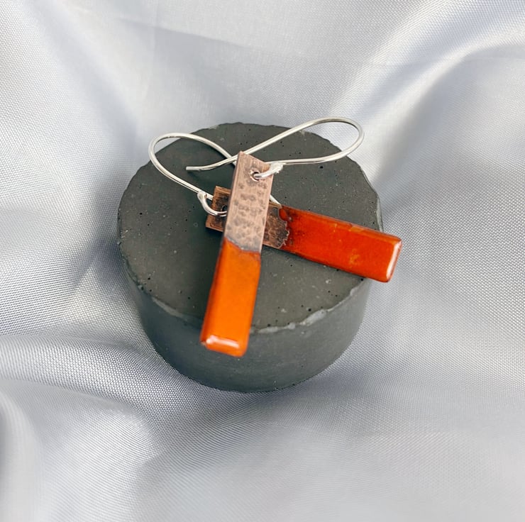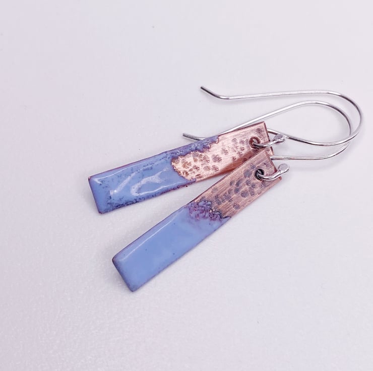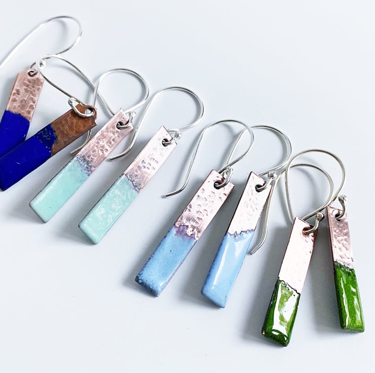 The earrings are textured with a hammer before the enamel is applied, then fired in a kiln at approx 833 degrees. This fuses the glass powder to the metal. A portion of the copper is left bare so that the colours compliment each other