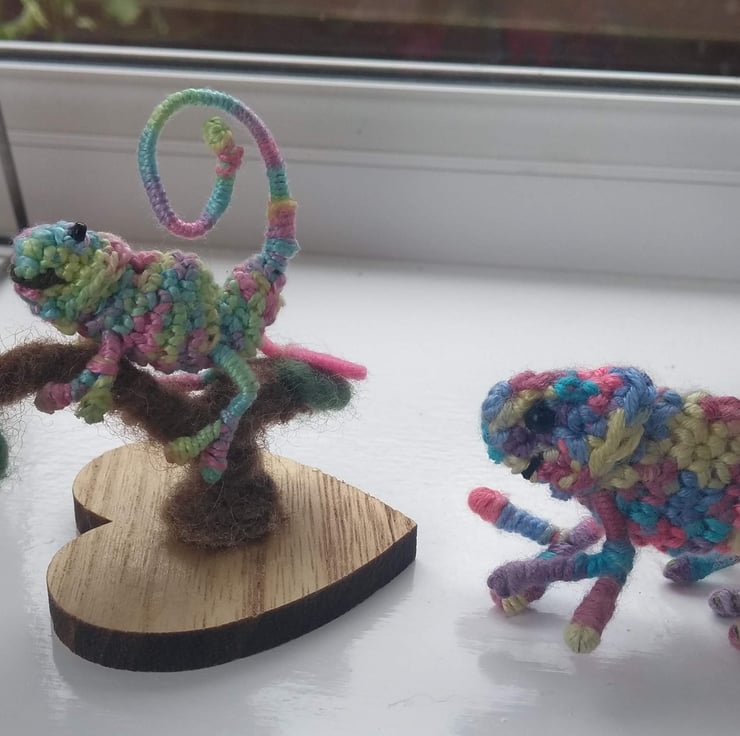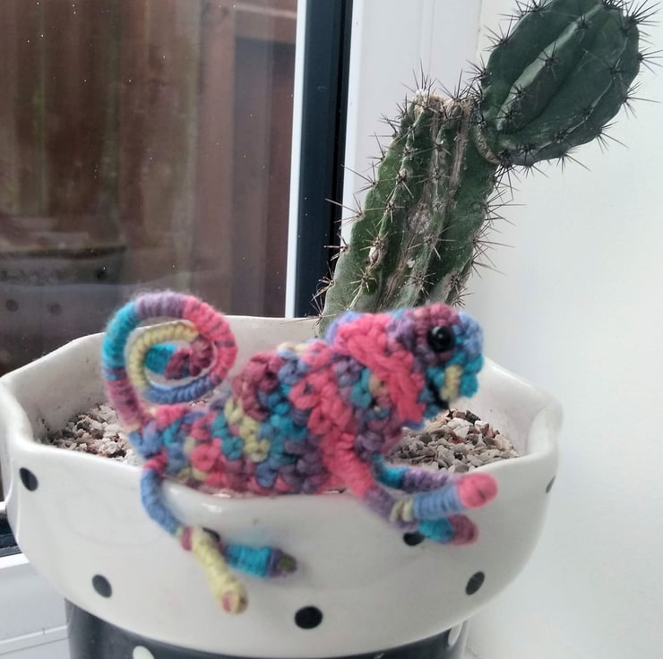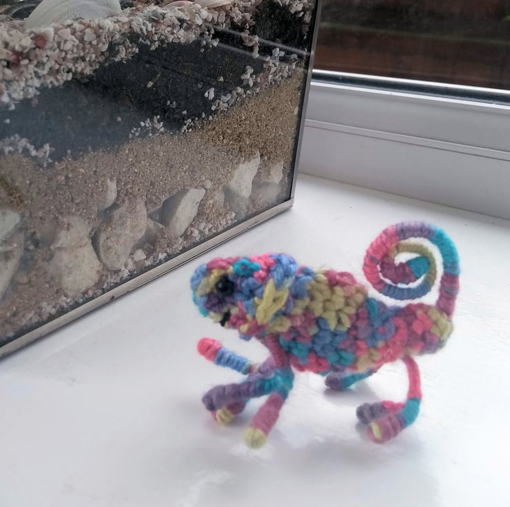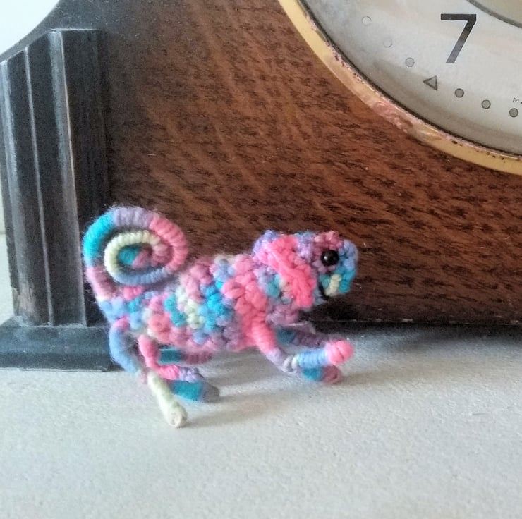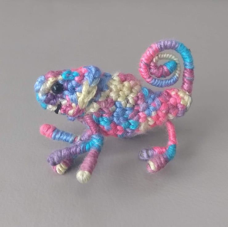 This colourful chameleon is made using a small crochet hook and multicoloured cotton thread. S/he has an embroidered smile and black shiny beads for eyes. Thread is wrapped round strong florists wire to create a curly tail and legs with toes, so s/he is poseable with care.