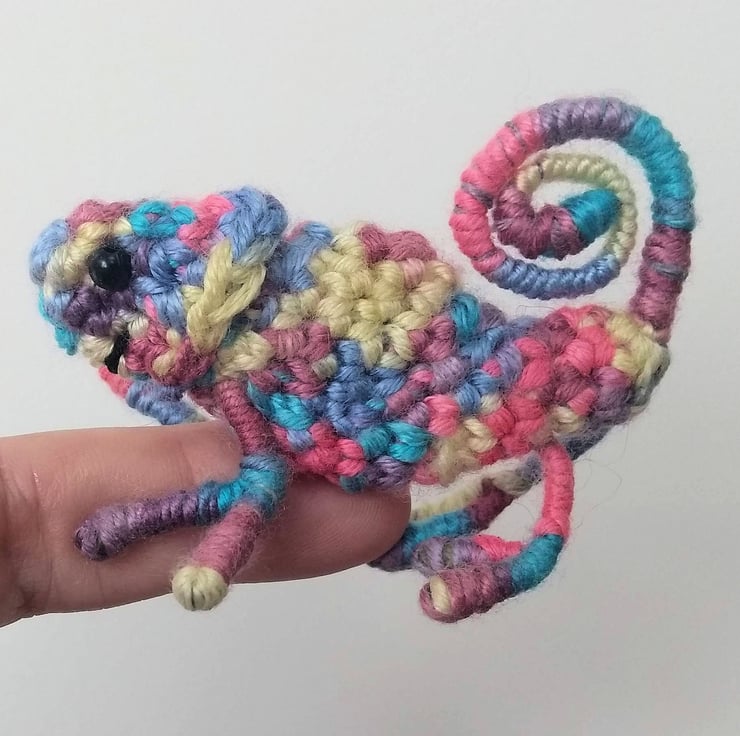 I love the wide variety of things you can make using crochet and enjoy testing the limits of my skills. This chameleon was easier to make than my smaller one as it uses a slightly larger hook and thicker thread so wasn't quite so fiddly to create. S/he is full of personality for something so small :)