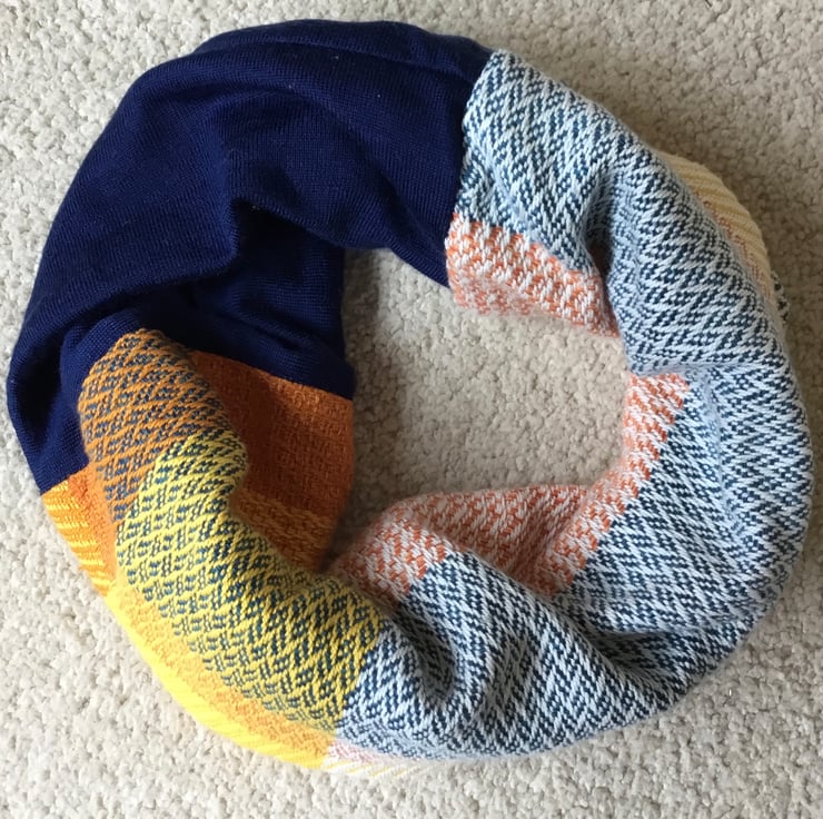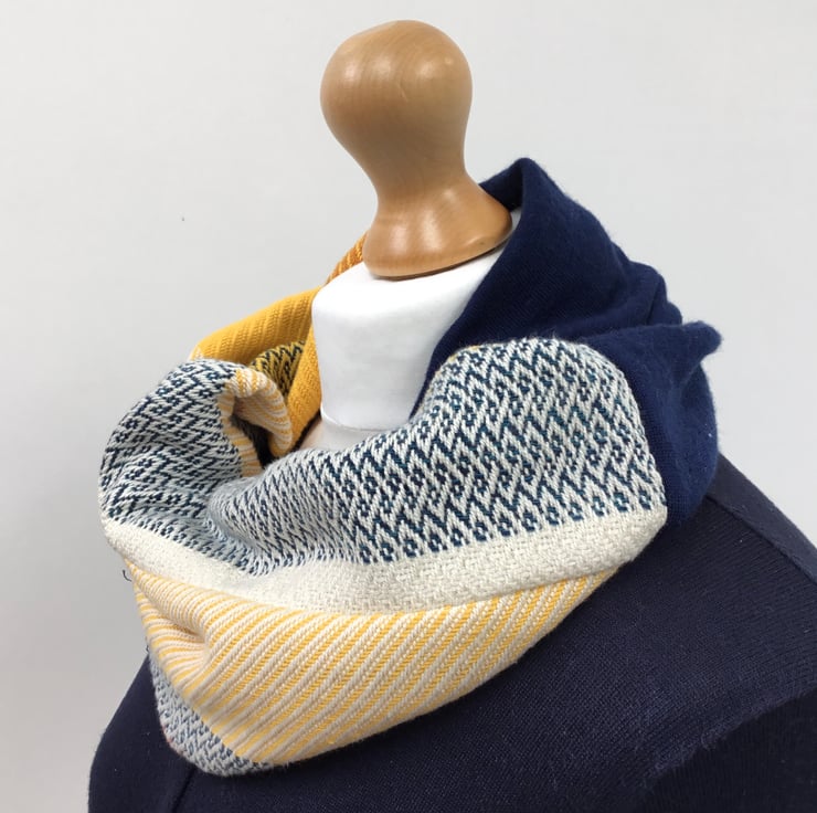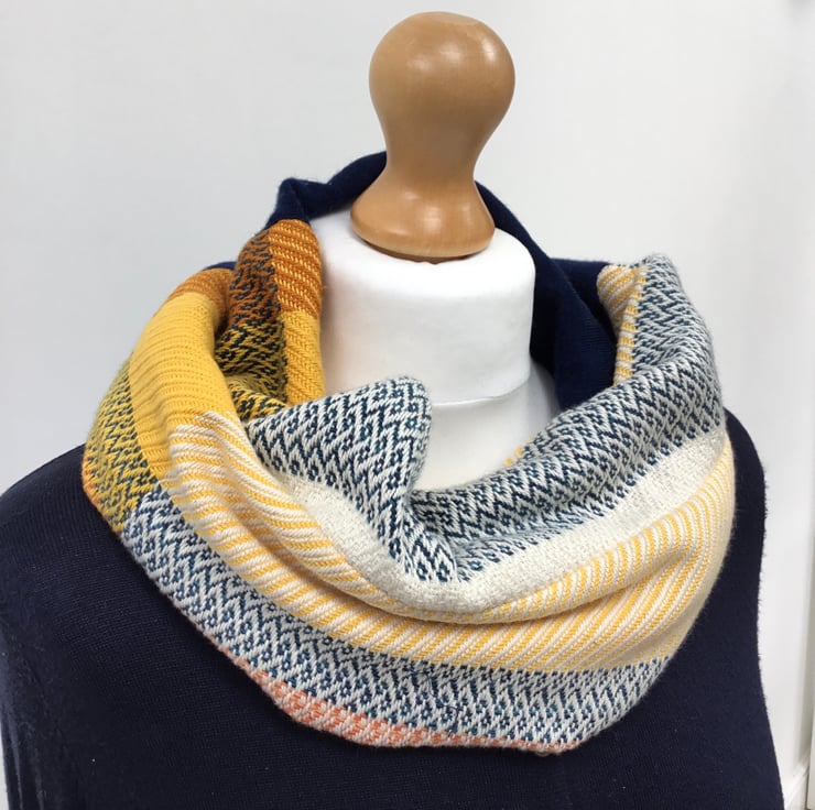 Handwoven fabric has been woven with yellow, orange, white, turquoise and navy cotton fibres and sewn with some deep navy blue fine merino repurposed knitted fabric. The cowl has been sewn as a tube with a very thin lining fabric, This cowl is gorgeously soft and comfortable and will lift any outfit in a unique way. Due to the colour variations in the weave it can look different depending on how it is worn.