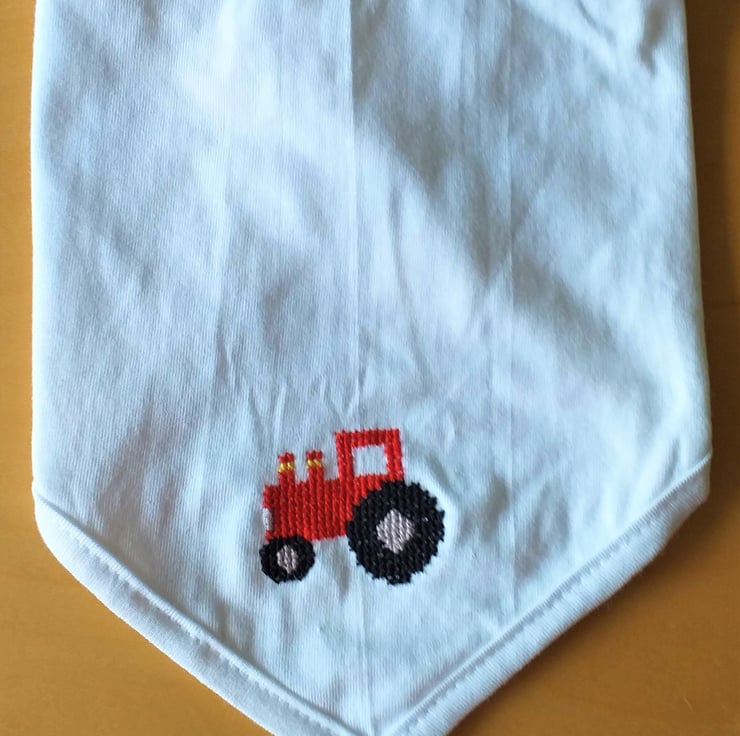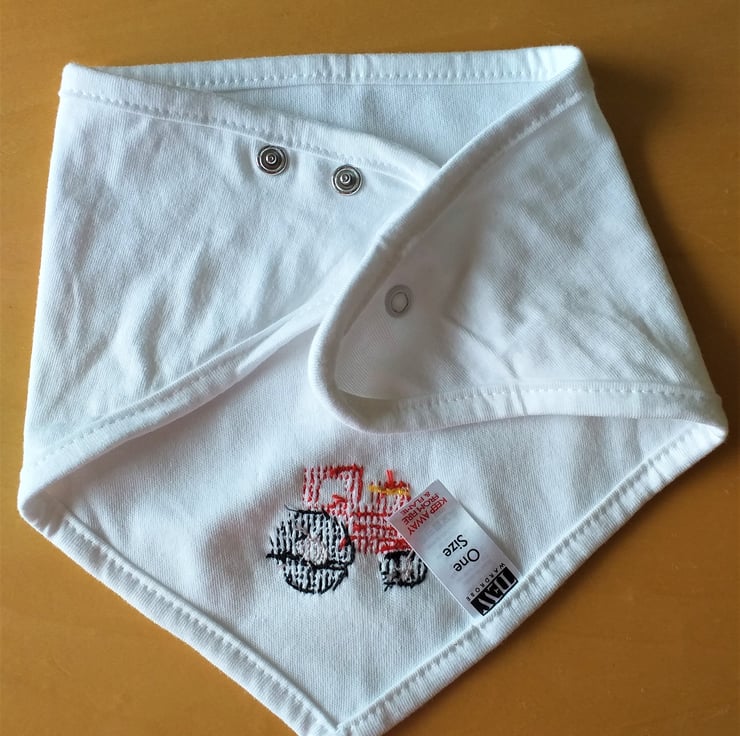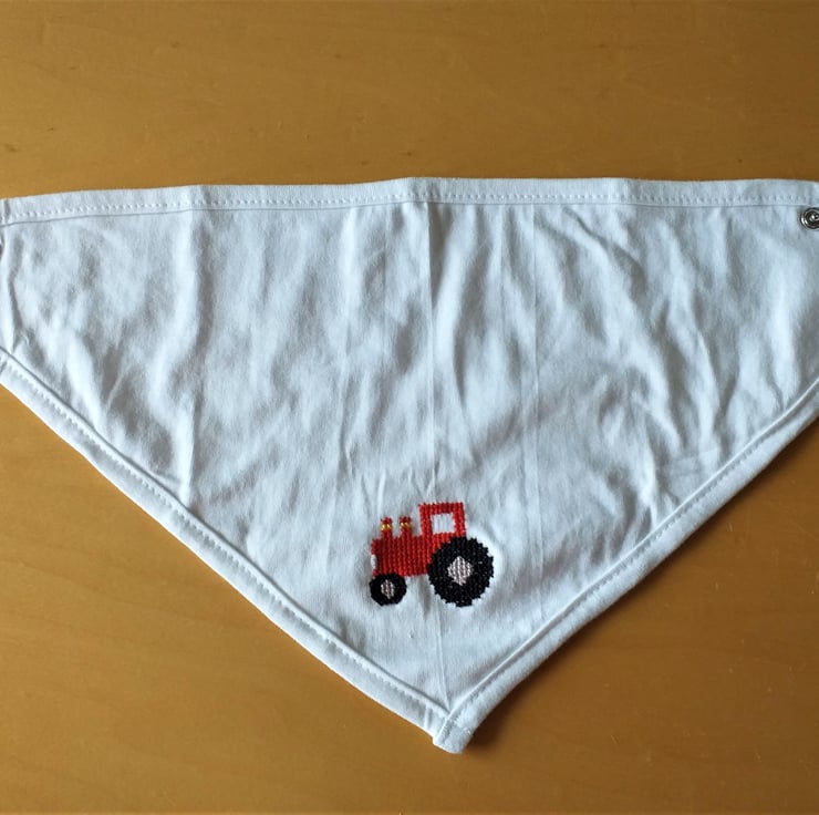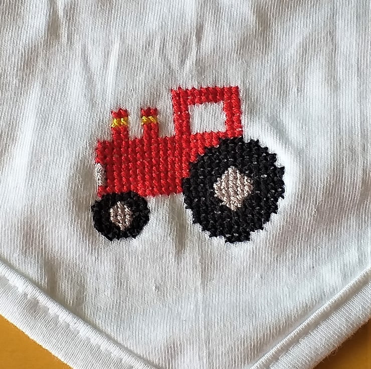 A gift for the diminutive tractor enthusiast? Or maybe the offspring of a farmer? I have hand embroidered a red tractor on the lower corner of a white dribble bib. The bib is all cotton, and machine washable. It has an adjustable press-stud fastening at the back of the neck