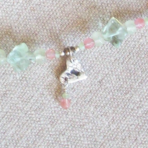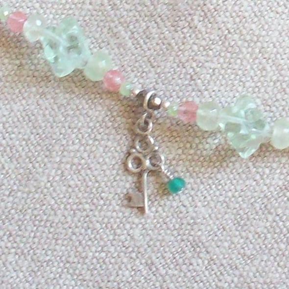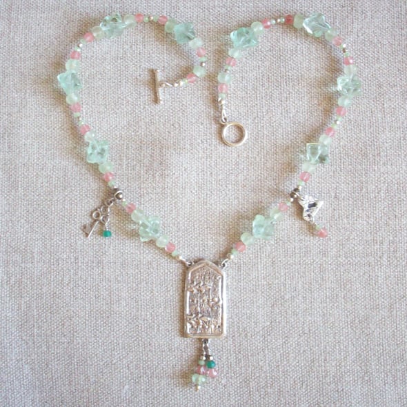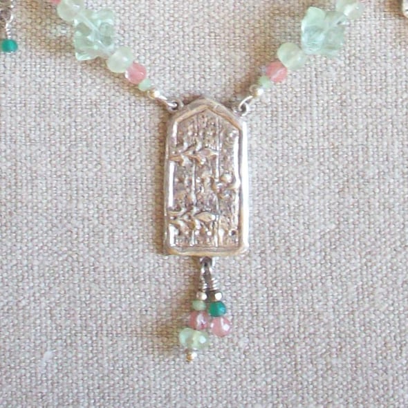A mysterious door ... to where? A fairy realm, a secret garden? 999 Fine Silver clay is carved into an old wooden door with Gothic hinges, on a neckace of pretty soft tones of green and pink. Decorative charms of a lock and key hang down. Fastening is a ring and T-bar in sterling silver. Comes to you in a gift box. Thanks for looking and for supporting hand-made!