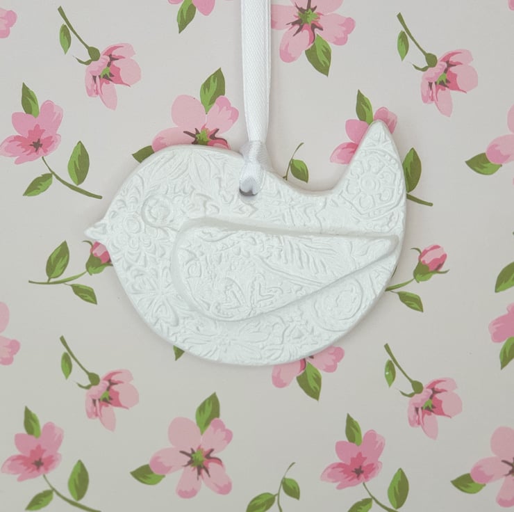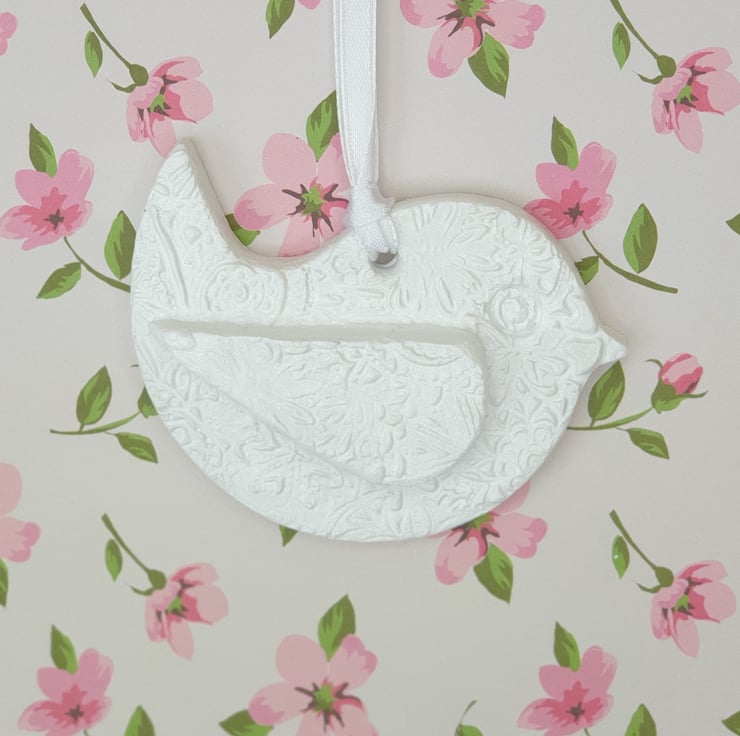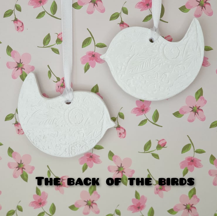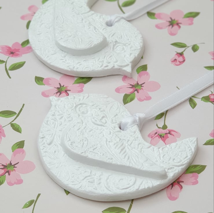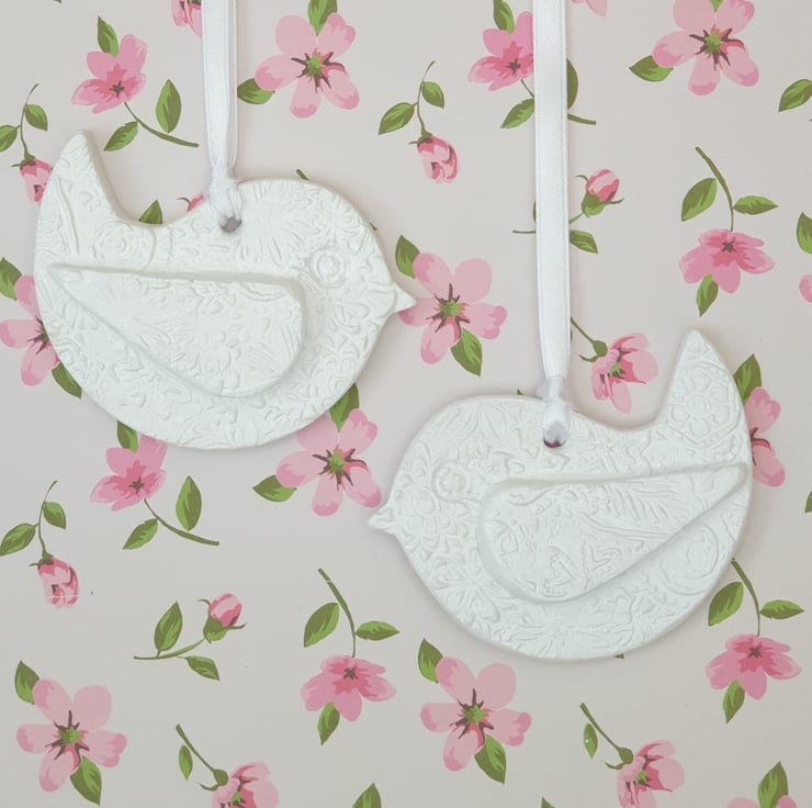 Pair of adorable little white birds which have been handcrafted from clay. The front of each bird has been decoratively textured and painted with white acrylic and then varnished for added protection. They are supplied ready to hang with white satin ribbon. These cute little birds would make a lovely addition to your home decor all year round or would be perfect for a wedding or anniversary gift or even as Christmas tree decorations. They will come prettily packaged in an organza bag finished with ribbon and a Crafty Nature tag making a lovely little gift.