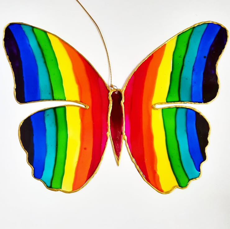 This is a handmade, handpainted rainbow Butterfly suncatcher