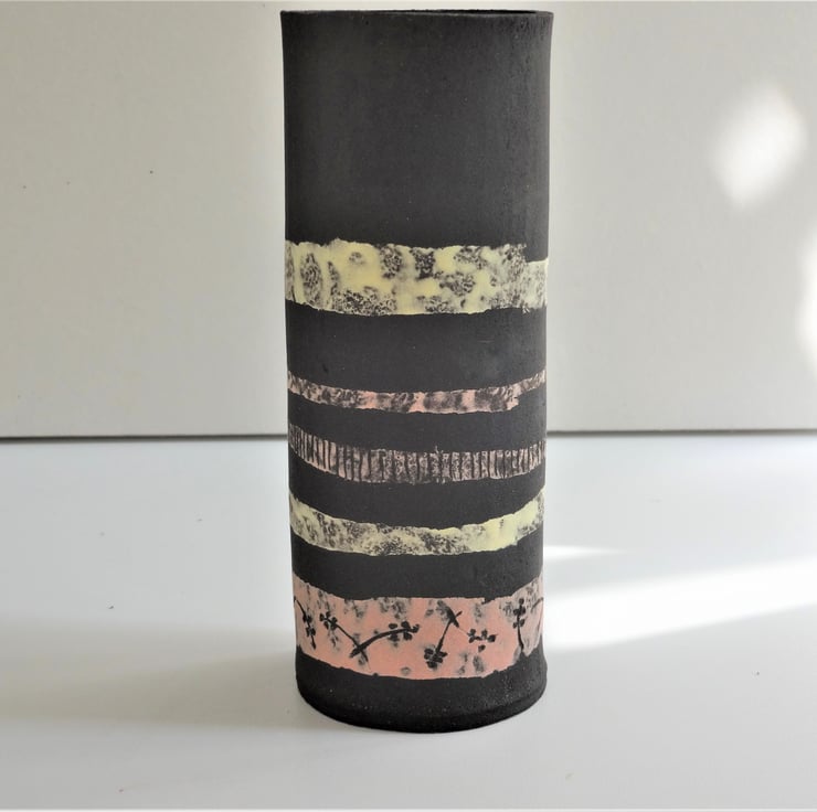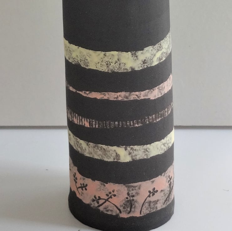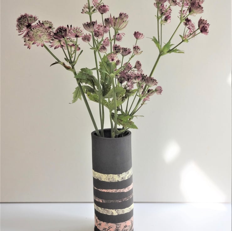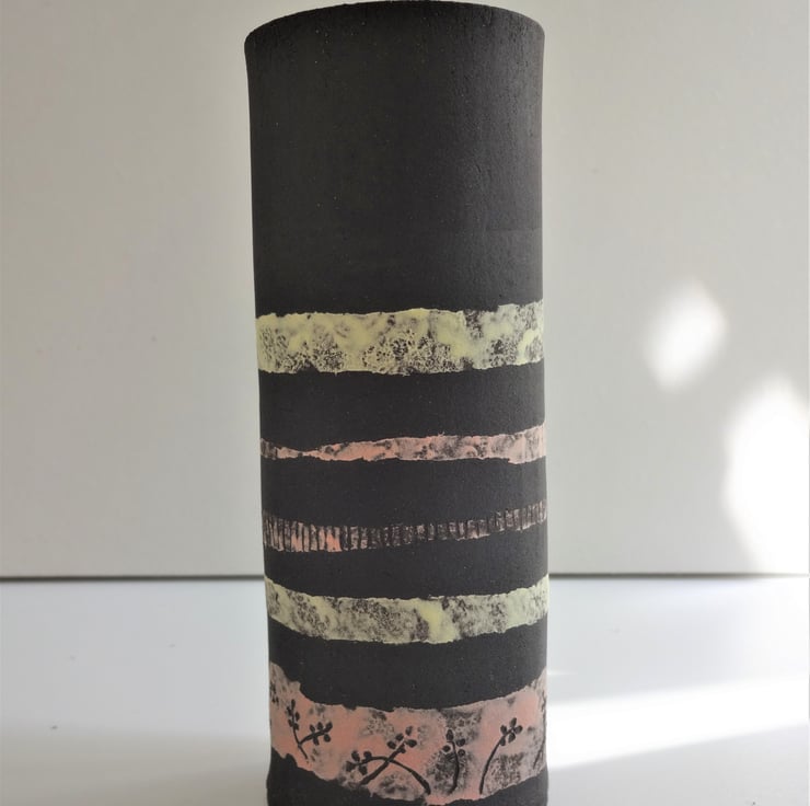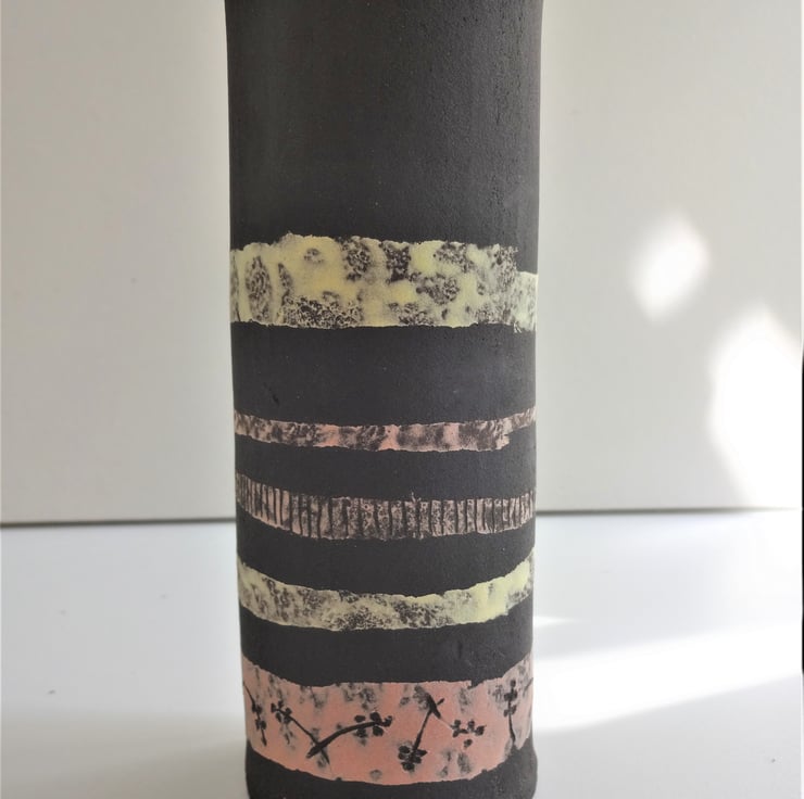 I decided on bands of colour in lemon and pink pastel shades to decorate this vase, a look that suits contemporary lifestyles and interiors. The bands feature incised motifs of plant bud forms and field furrows, a technique known as sgraffito which shows off the black clay. Inside I have used an iron lustre glaze which fires to subtle shades of very dark blue, mustard and russet. The overall shape I form with my hands, folding a sheet of clay into a soft oval shape. Zoe can show off informal arrangements of garden flowers, wildflowers or grasses, fresh or dried, and gives a lovely light and fresh feel to your interior look. Zoe is 16.5cms high and 6cms at the widest part of the oval.