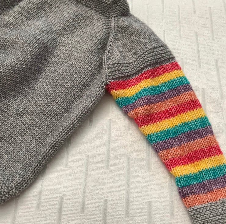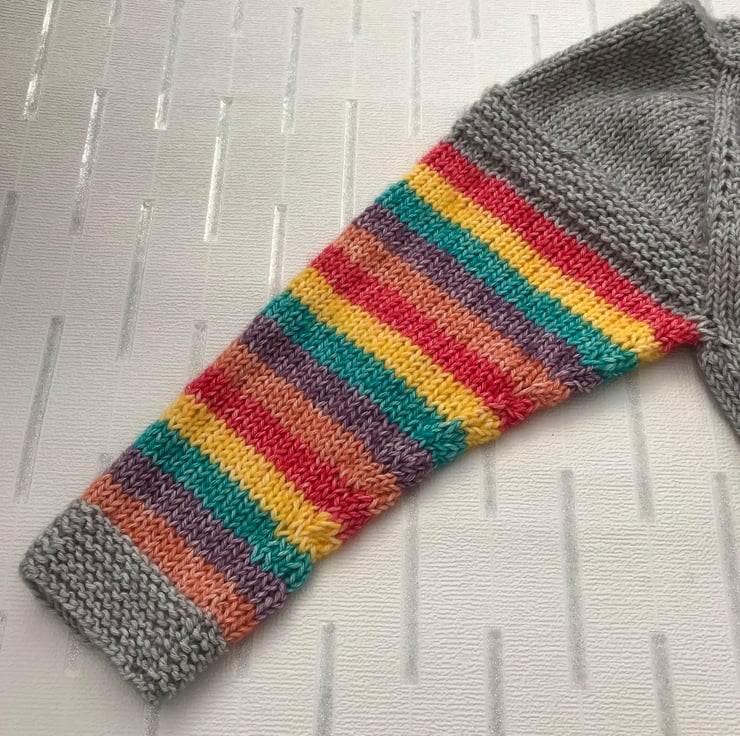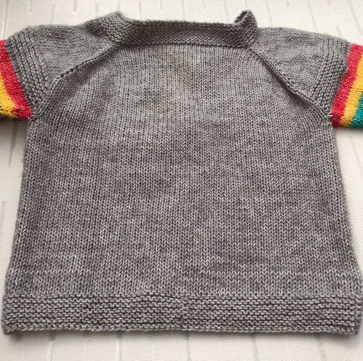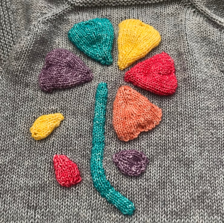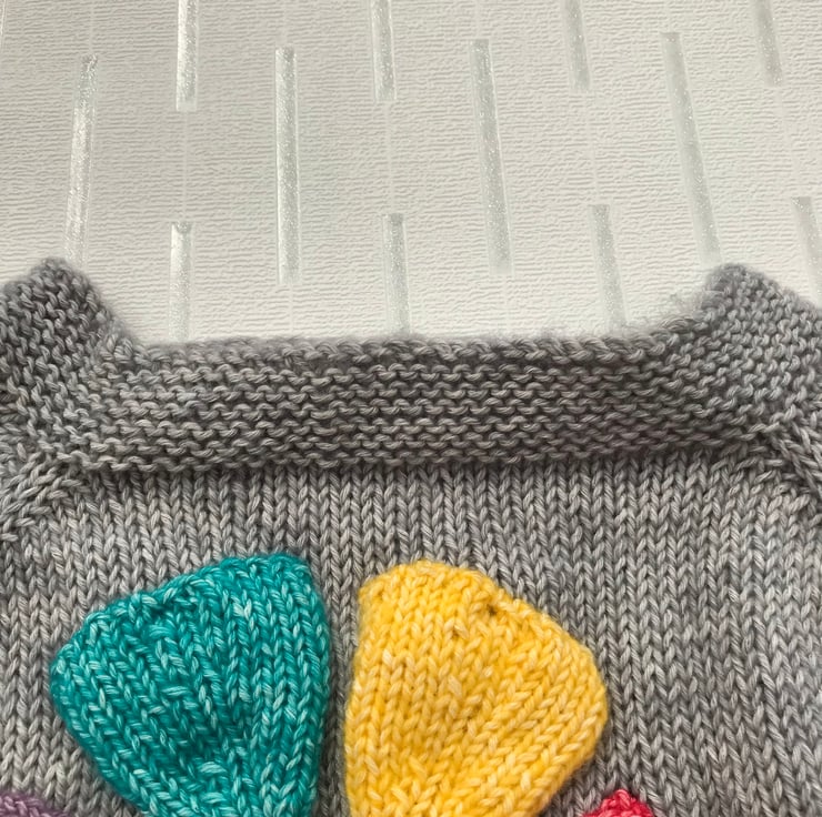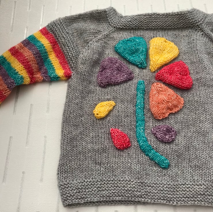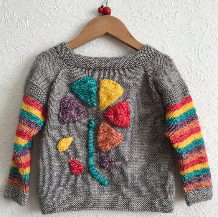 This bright and cheerful jumper is hand knitted in a stonewashed effect cotton and acrylic yarn. The background is grey and the flower added to the front is red, yellow, turquoise, purple and orange. The sleeves have stripes in the same colours. It has a boat shaped neckline worked in garter stitch to match the hems.