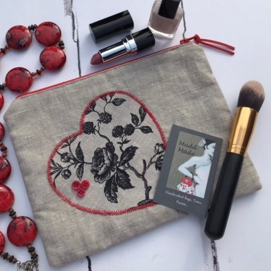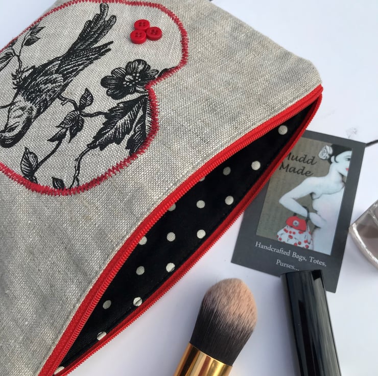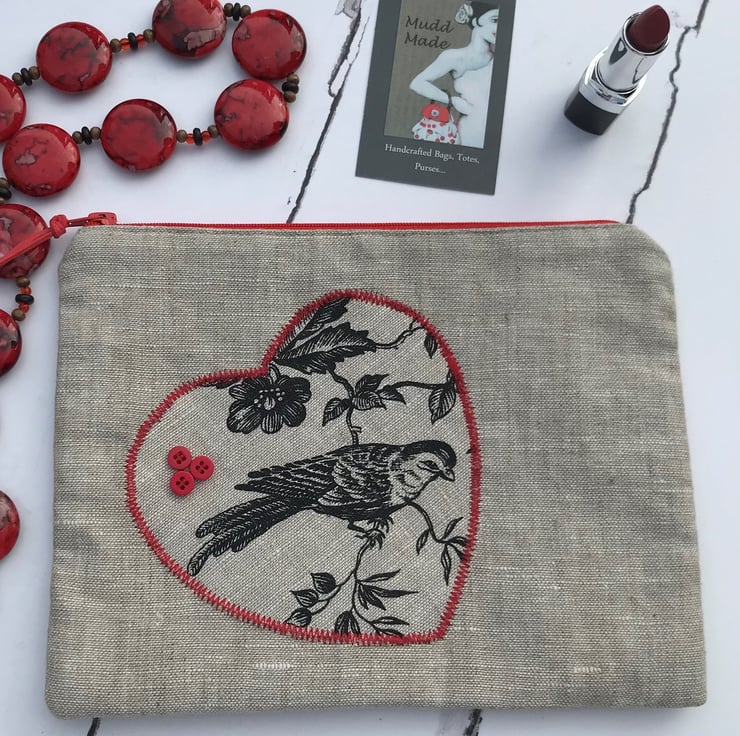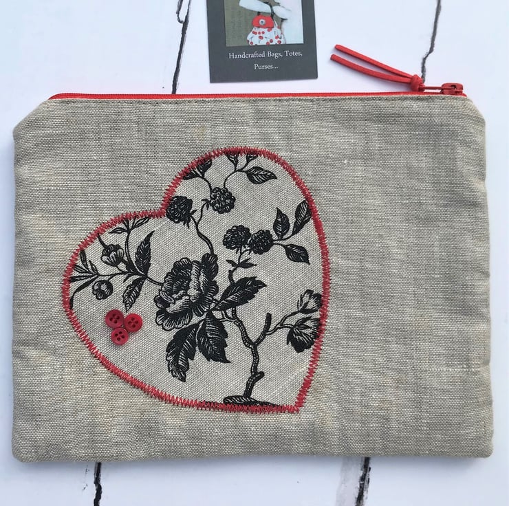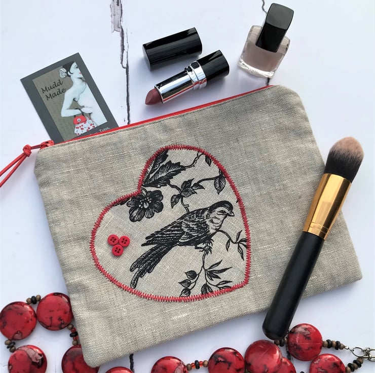 Lovely large linen fabric makeup/jewellery pouch. The bag has a linen fabric heart appliqued on both sides in red thread, one heart shows florals, leaves and a bird, the other florals and leaves, all in black, finished off with three sewn small red buttons each side. The lining is a black with white spots cotton, and closes with a red zip with red faux leather pull. The pouch is interlined for a little structure.
