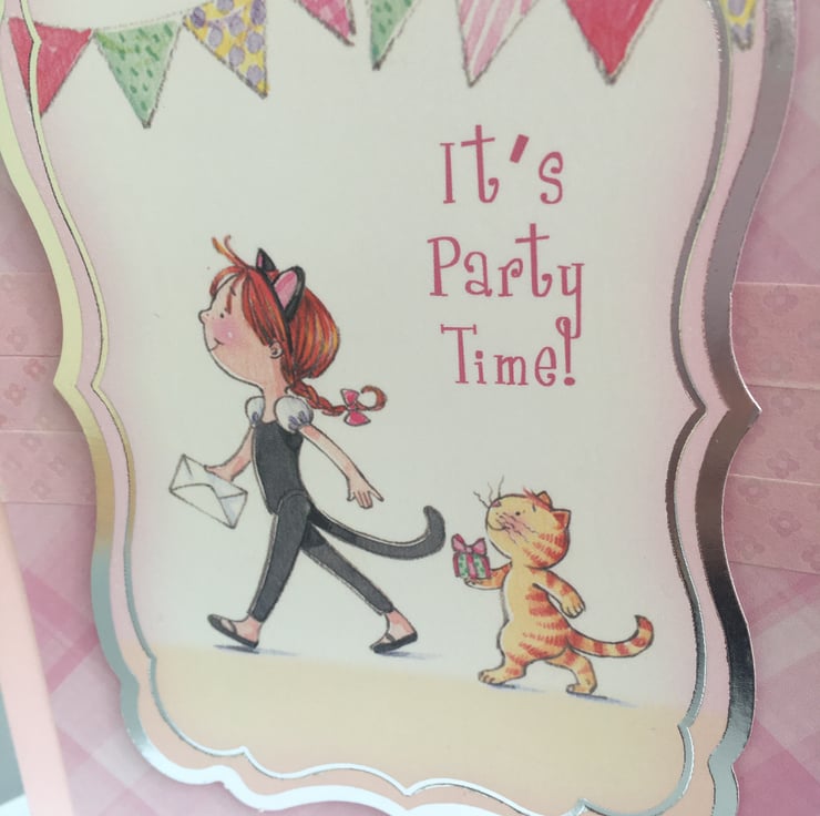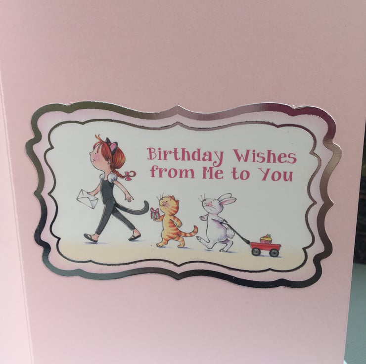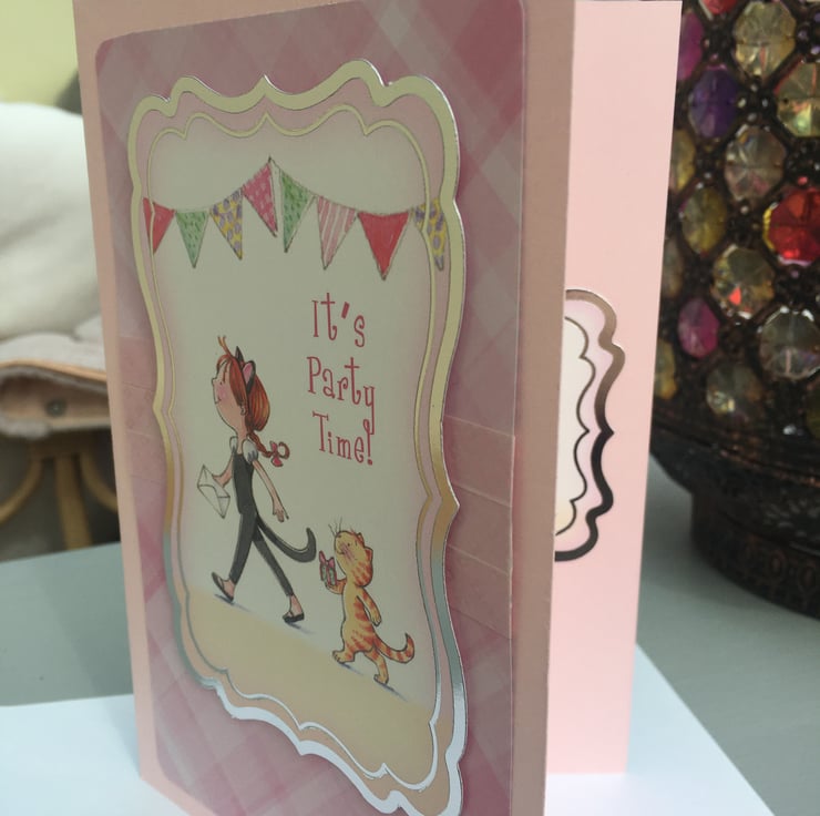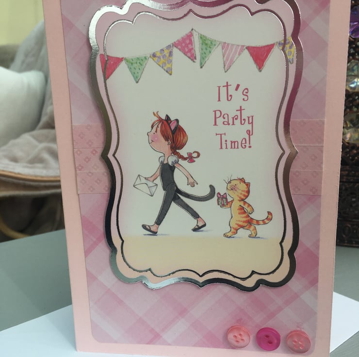 A sweet little card for a sweet little girl. This A6 sized card is in delicate shades of pink. The base card is pink with a check paper on top. Pale pink floral Washi tape adds a little detail. A fancy shaped topper has a little girl and cat are on the front. 3 pink buttons finish the design. Inside the card has the greeting Birthday wishes from me to you.