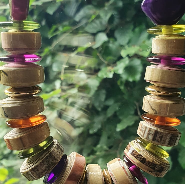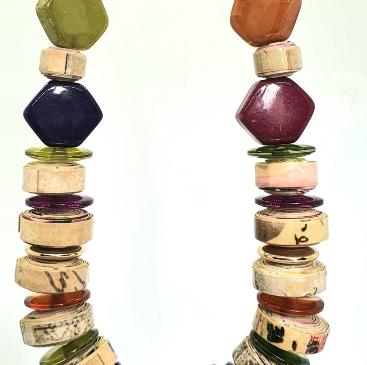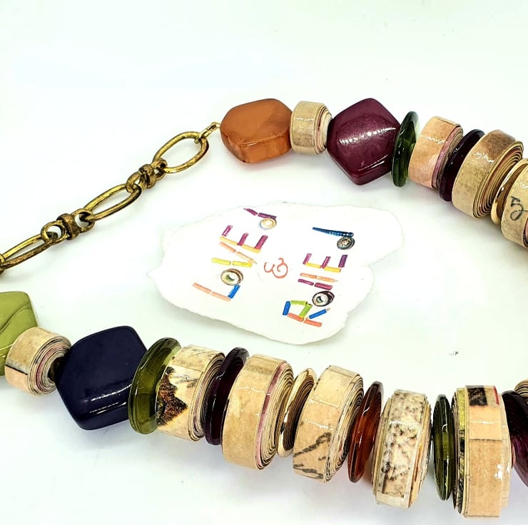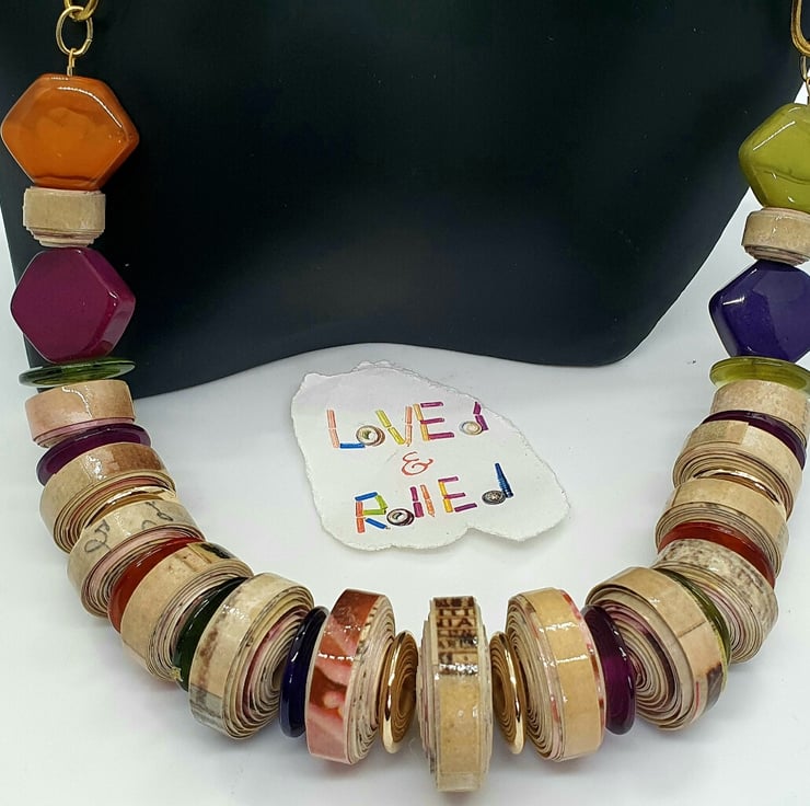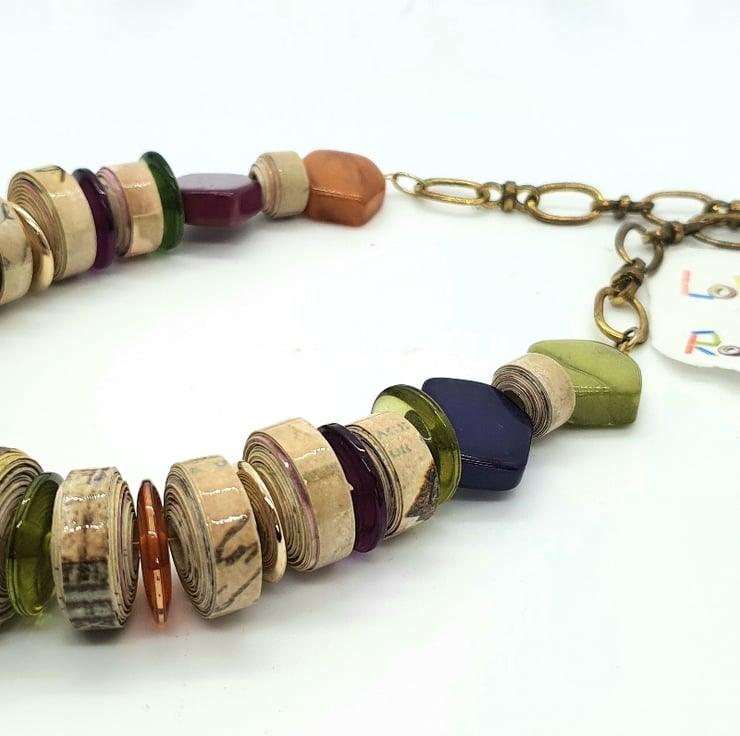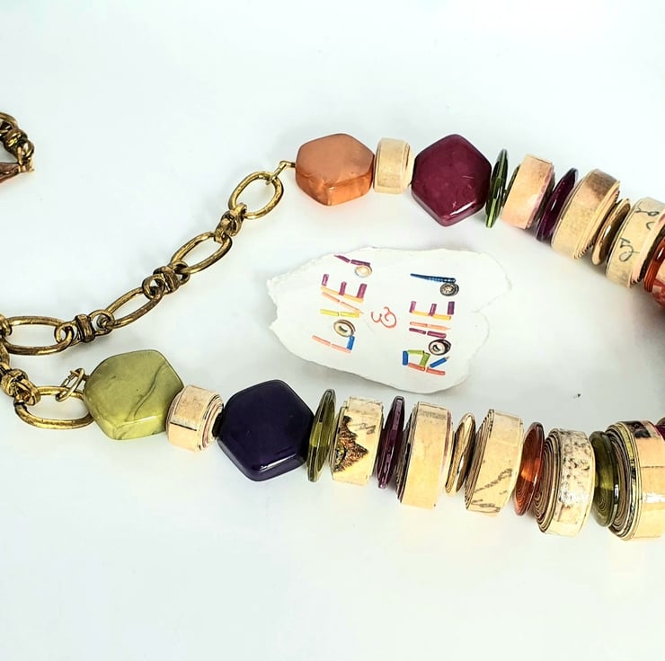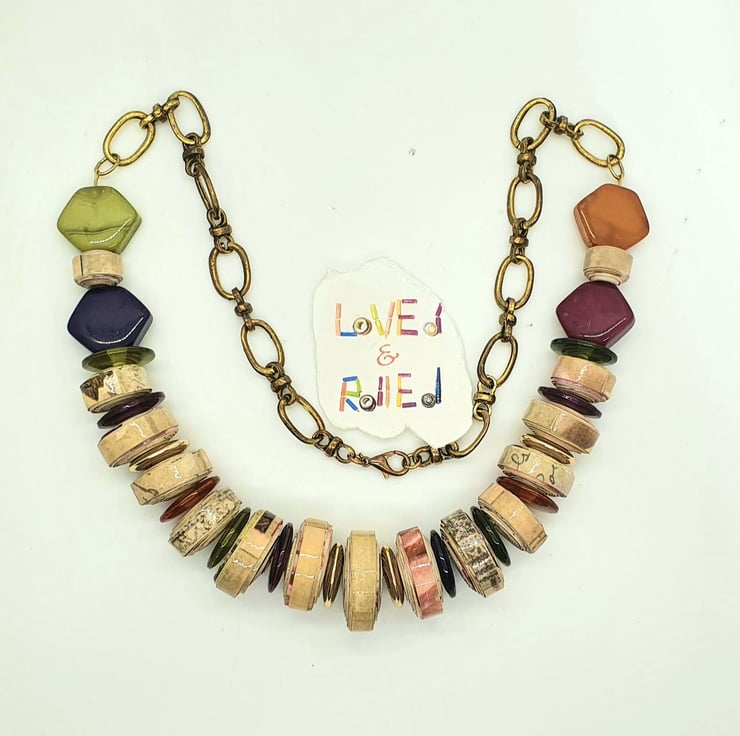A colourful, stylish necklace made of paper beads and preloved multicolored beads that catch the light.