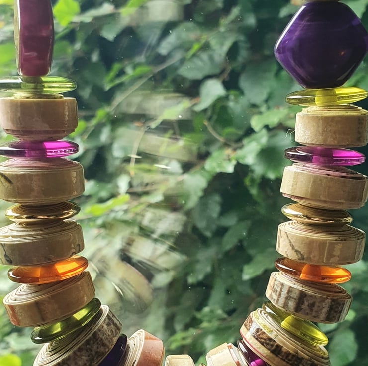 I use recycled paper and I get inspiration from the colour of the paper and whichever pre-loved beads I could find to complement my design - This means that no two pieces are alike.