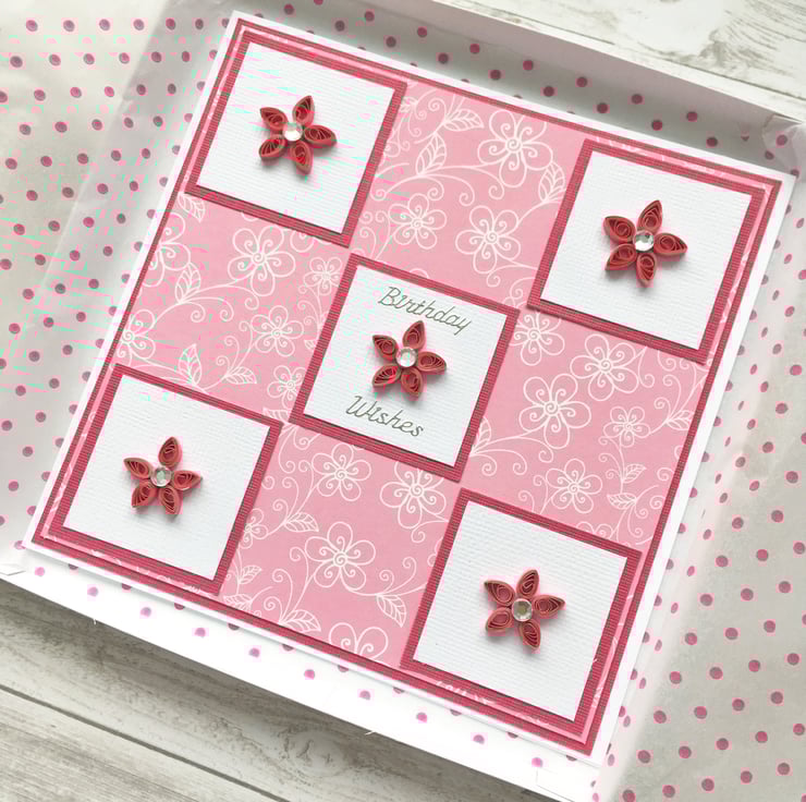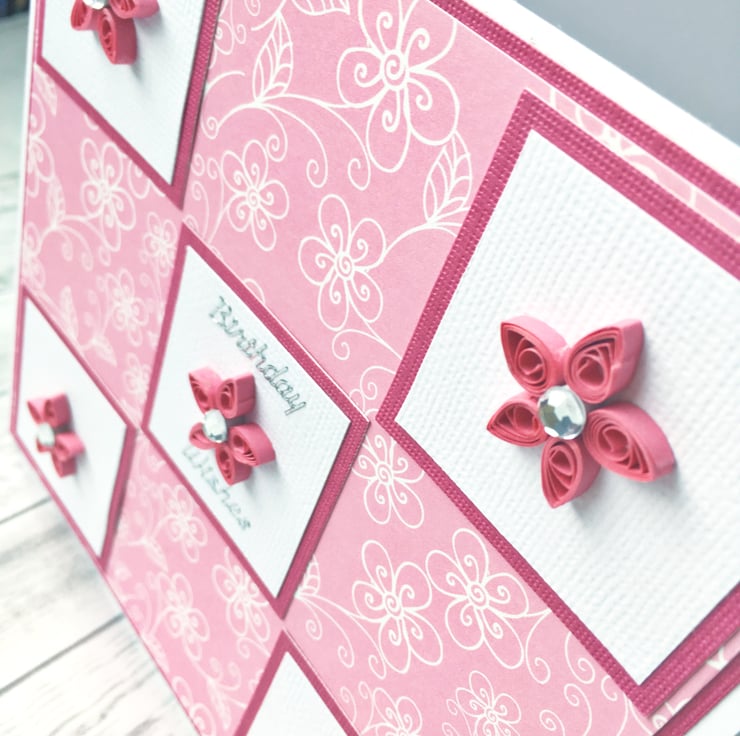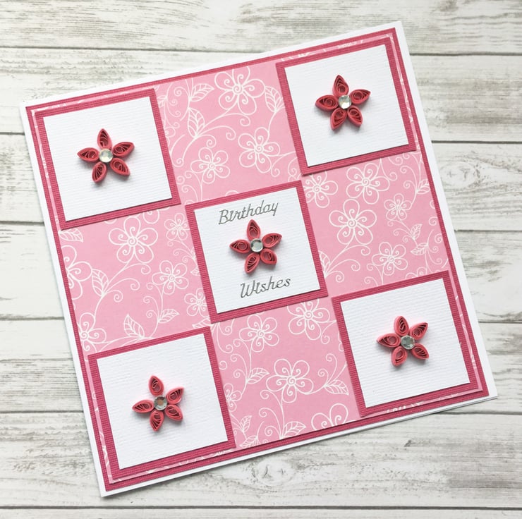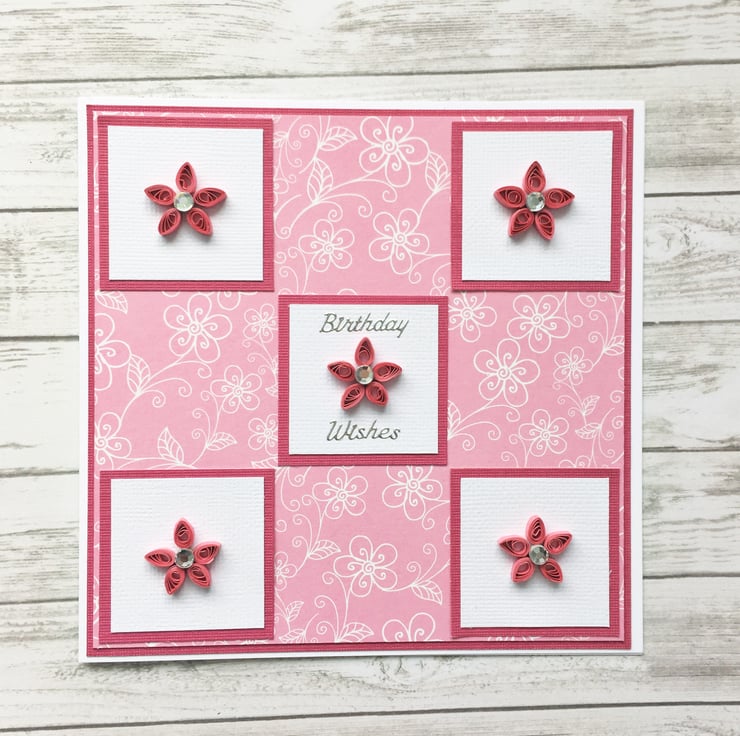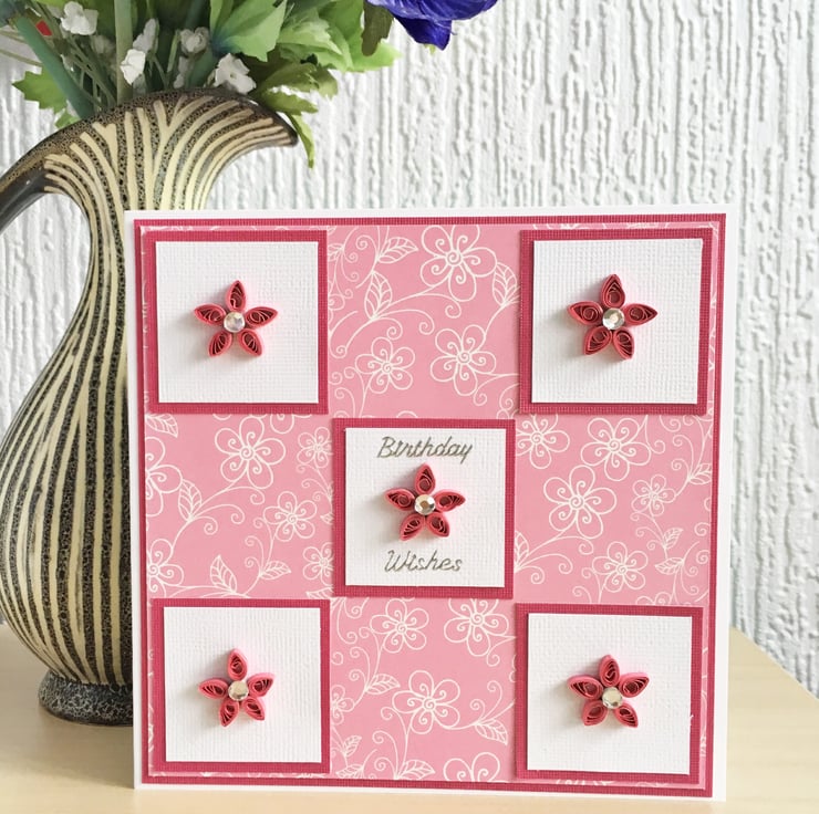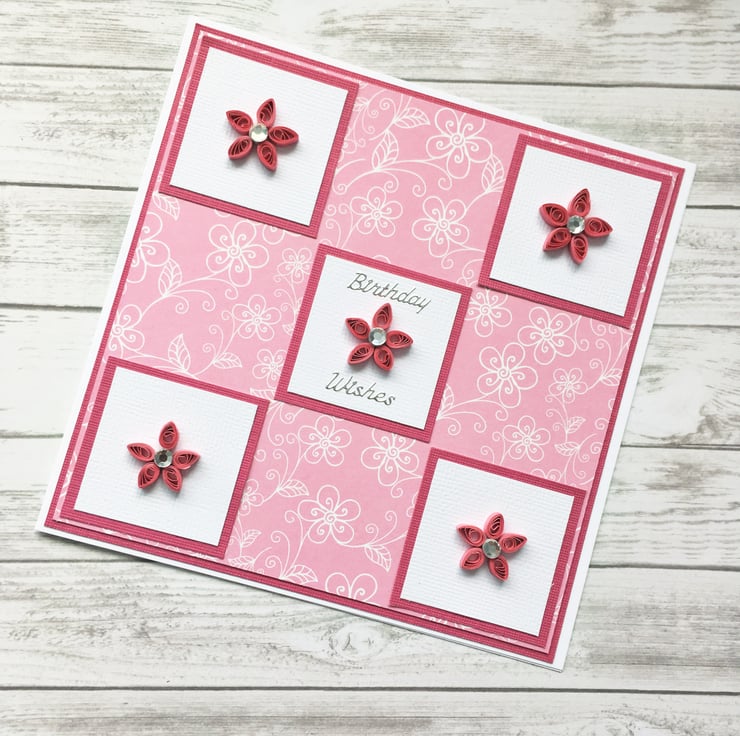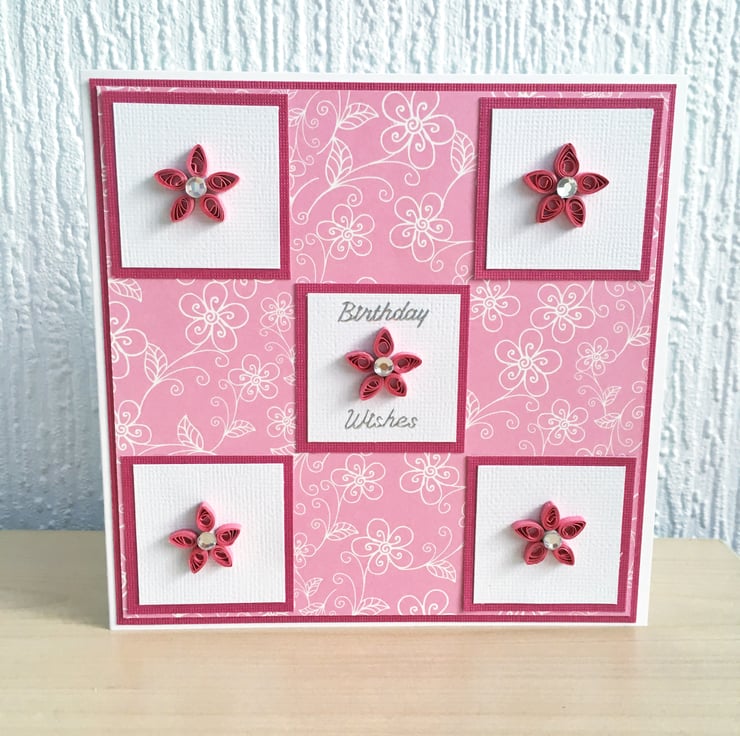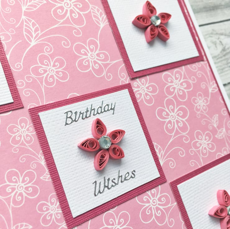 Five pink quilled flowers with embellished centres are arranged on patterned paper in a 9 block patchwork quilt design. The card says Birthday Wishes in delicate silver foil letters in the centre square.