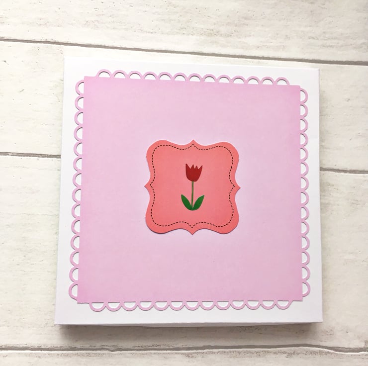 This card measures 15cm by 15cm and comes with a matching white envelope. It is blank inside for you to write your own greeting.