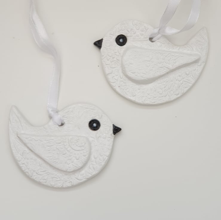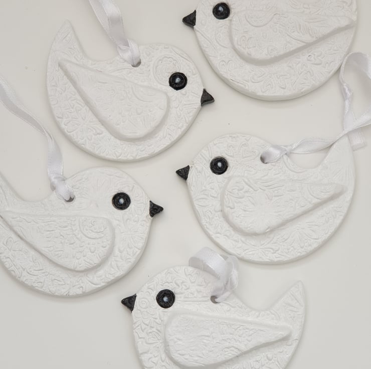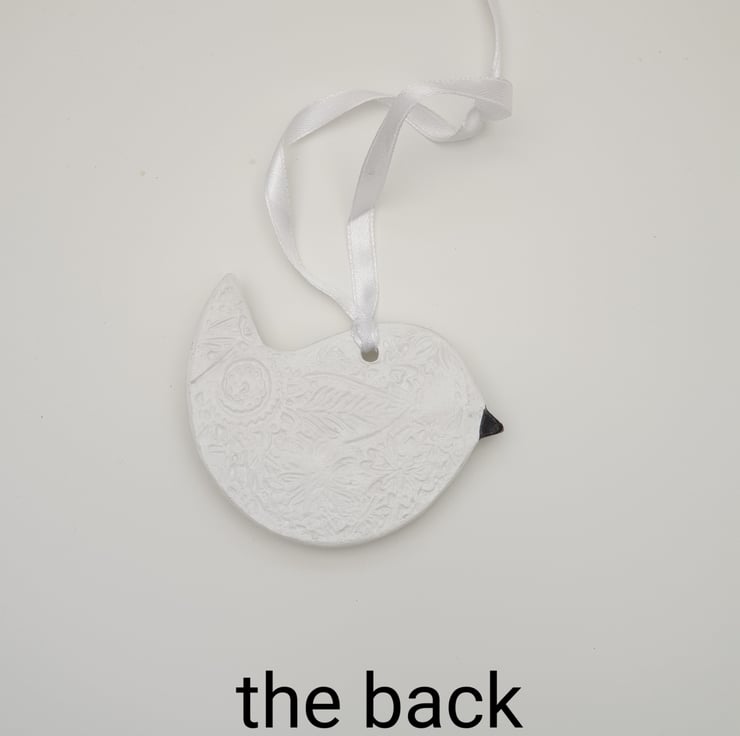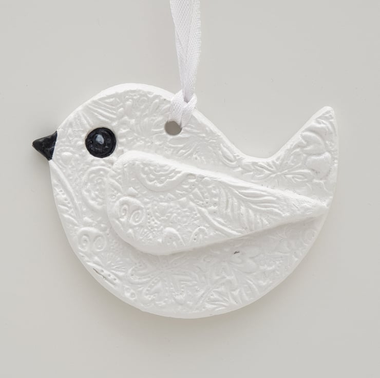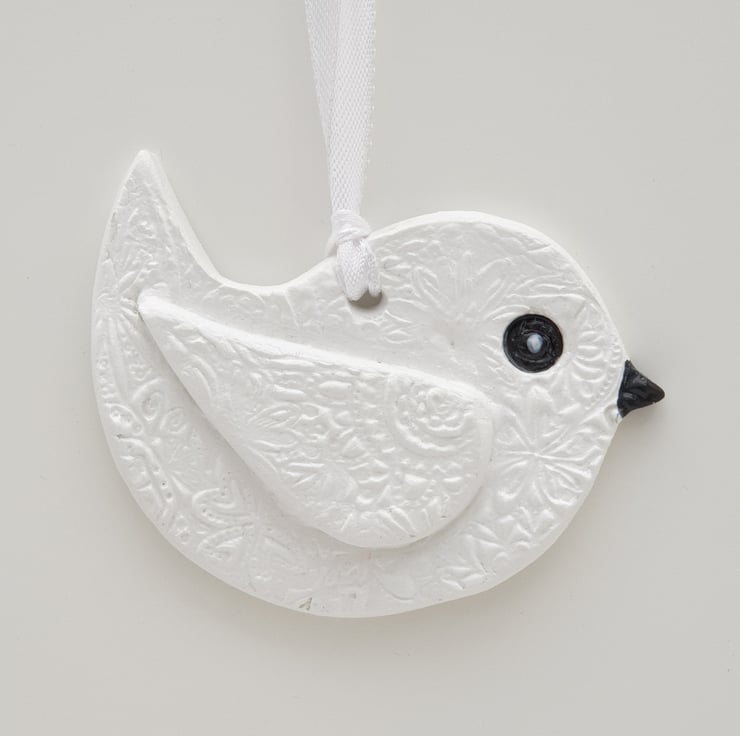 Very cute little white bird which has been lovingly handcrafted from clay. The front of the bird has been decoratively embossed and painted with white and black acrylic paint and given a coat of varnish for added protection. As these little birds are handmade, the one supplied will differ slightly from the photos. Each bird will have a slightly different pattern and no 2 will be exactly the same due to the making process but this just adds to their character and makes each one unique.