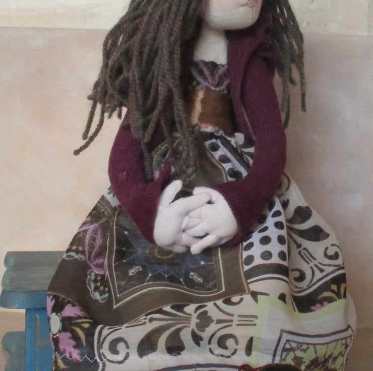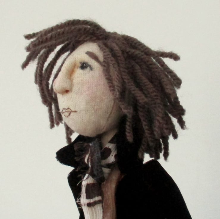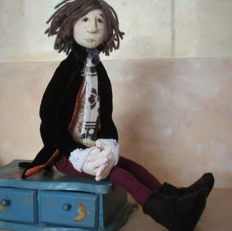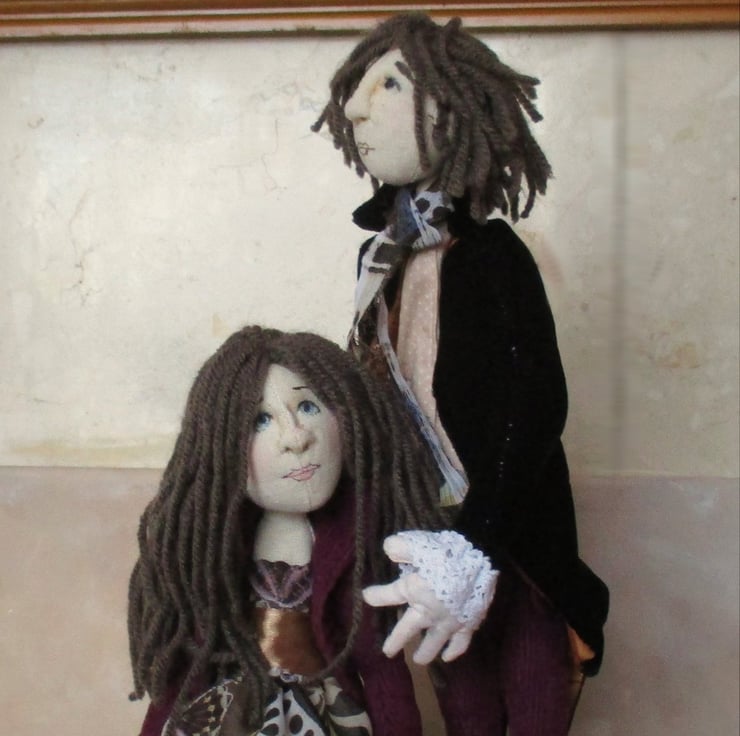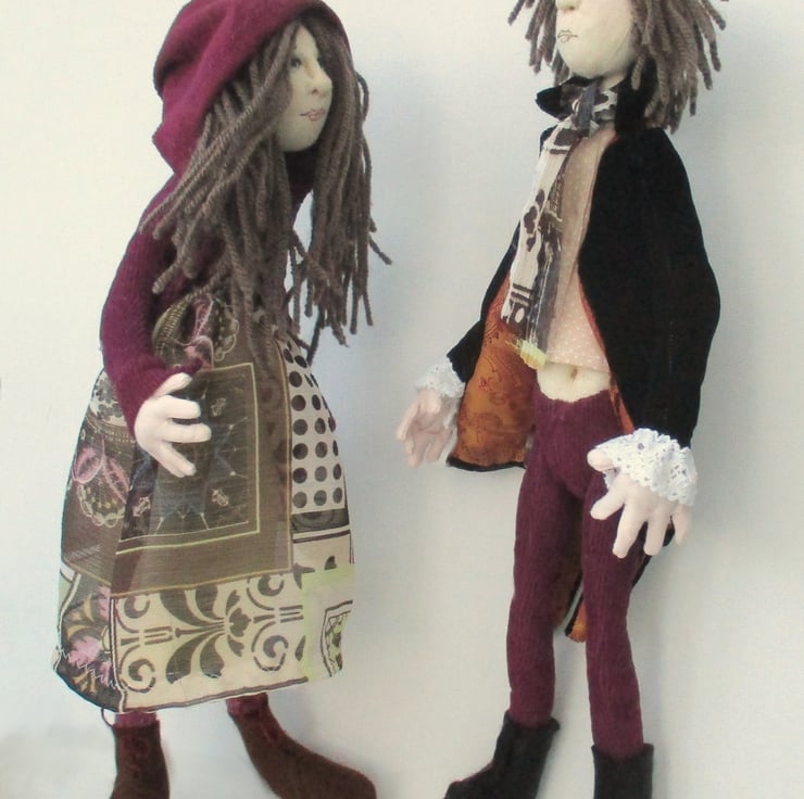I'd been making child-like cloth dolls and decided time to made some slim, tall elegant ones. Not sure these are that elegant but some super vintage black velvet was perfect for Oberon's tails and mixing the needle cord jacket with organza fabric was fun. Hope you enjoy these too : )