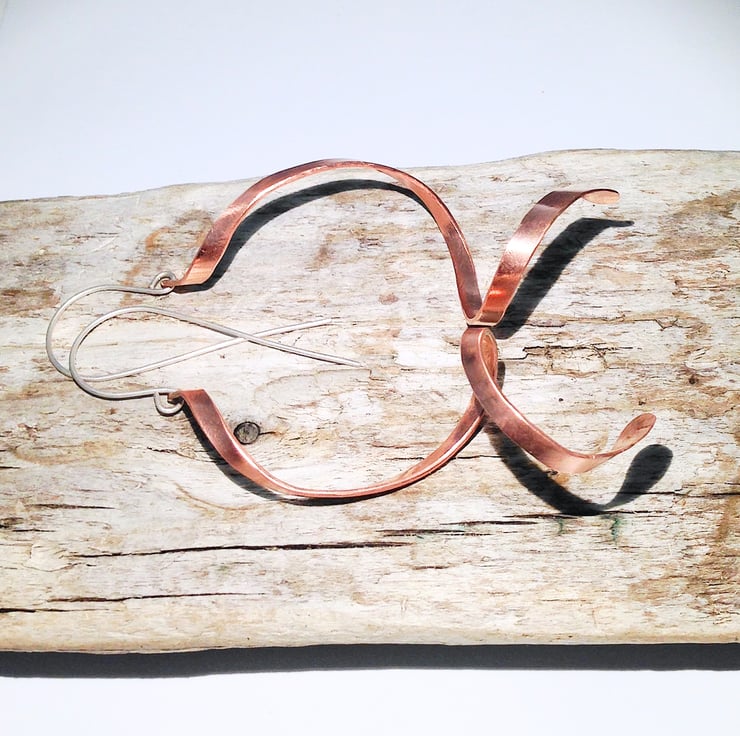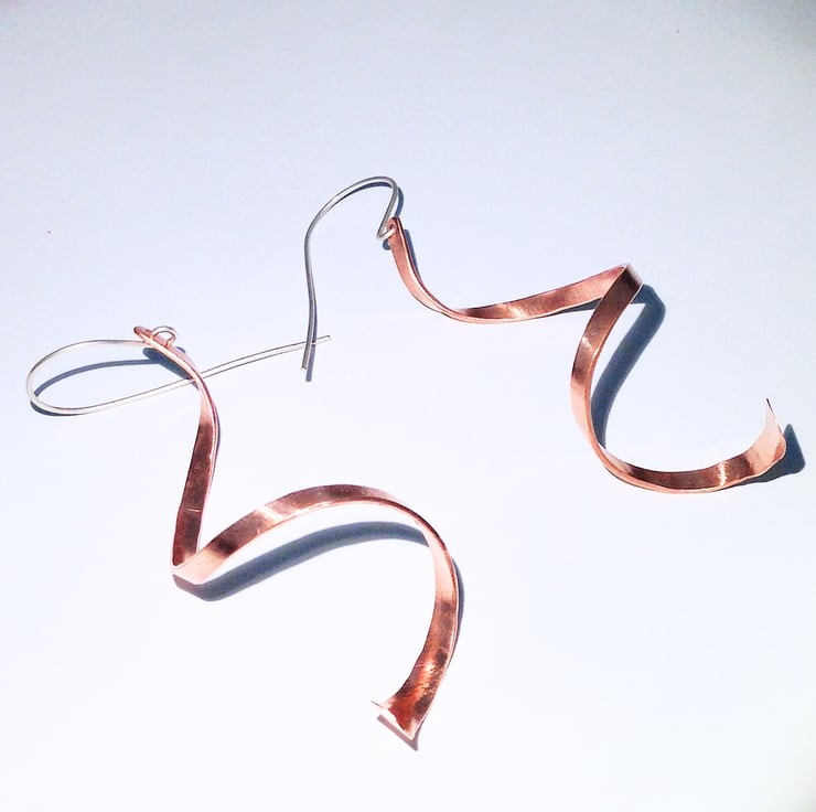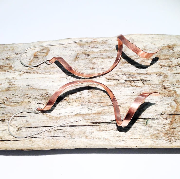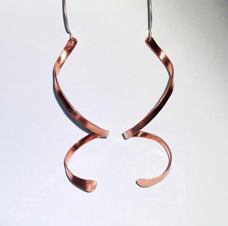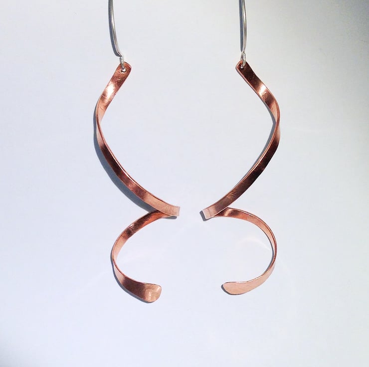 I've made these stylish earrings from 2 mm copper wire which I have repeatedly flat hammered to create a rustic hand hammered finish before creating the loose spirals. They measure approximately 7 cm long and hang from handmade sterling silver earring wires.