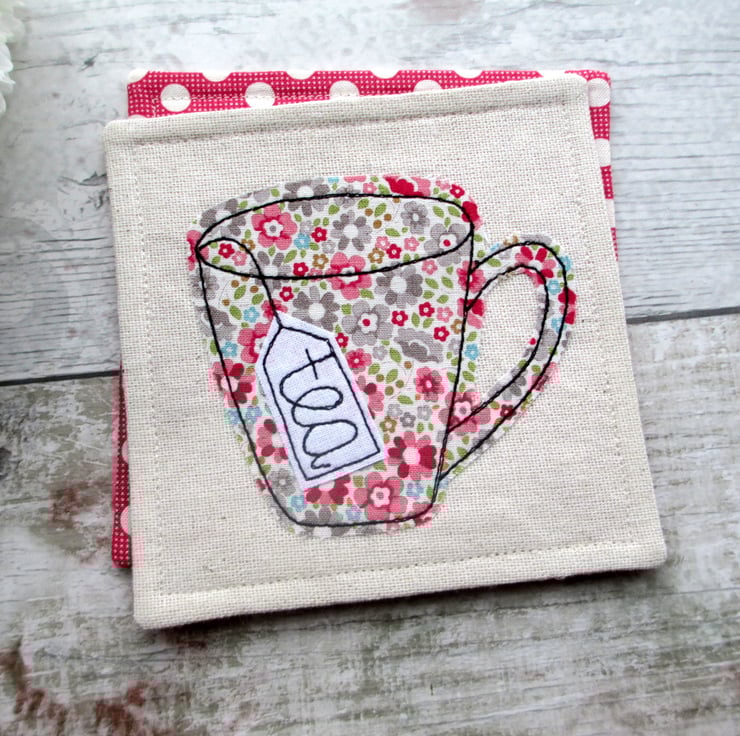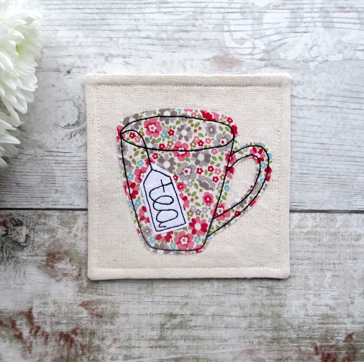 A mug of tea coaster in a pretty summer floral Tilda fabric, a cute gift idea for a tea lover!