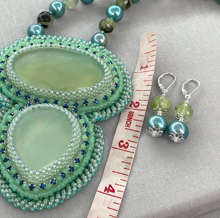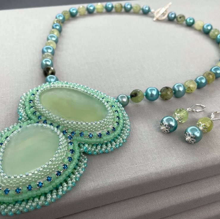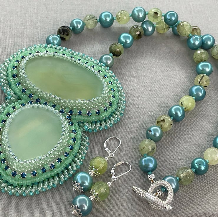 A one of a kind set comprising of a bib style necklace and earrings featuring a large beaded pendant of Agate with faceted Prehnite and teal coloured cultured Pearls.