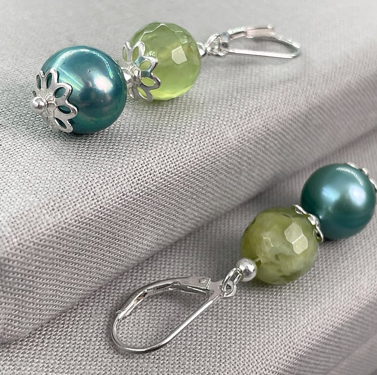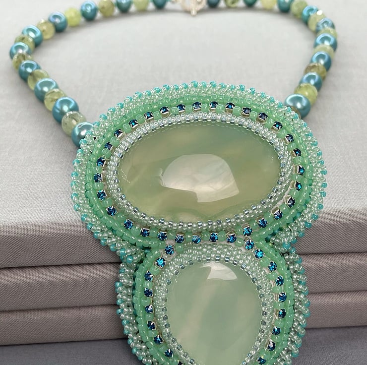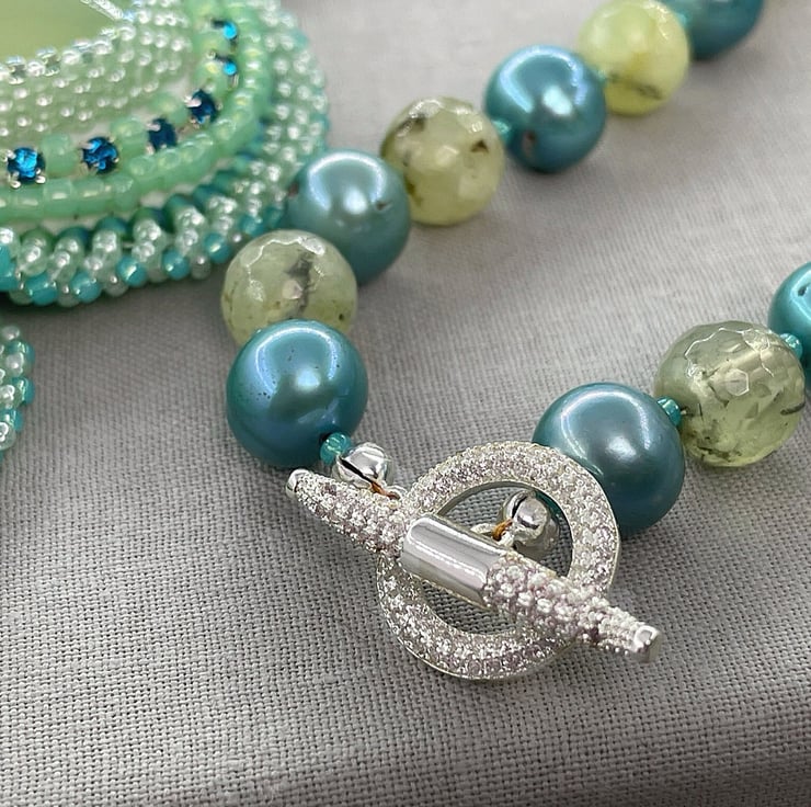 The necklace isn’t weighty when worn and as the pearls and prehnite are 8mm, the necklace is quite chunky.