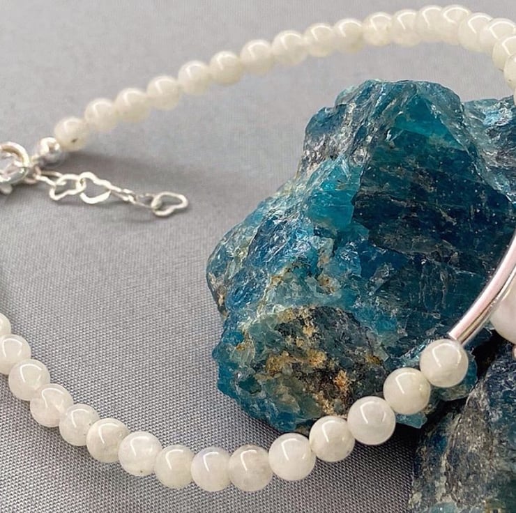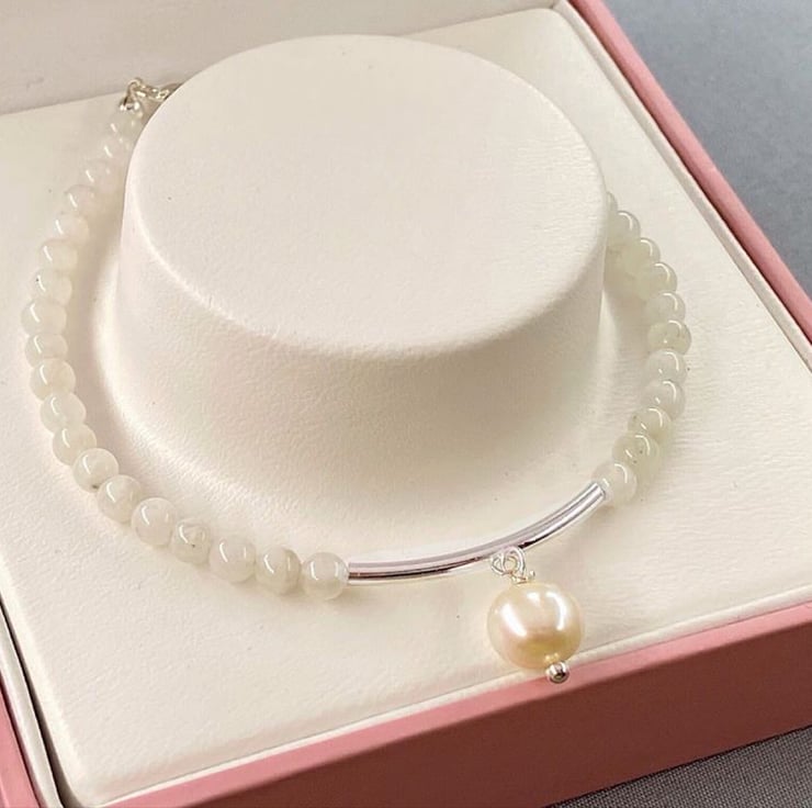 An extremely pretty and dainty bracelet featuring faceted Rainbow Moonstone and a single ivory high lustre round cultured pearl suspending from a sterling silver bar connector.