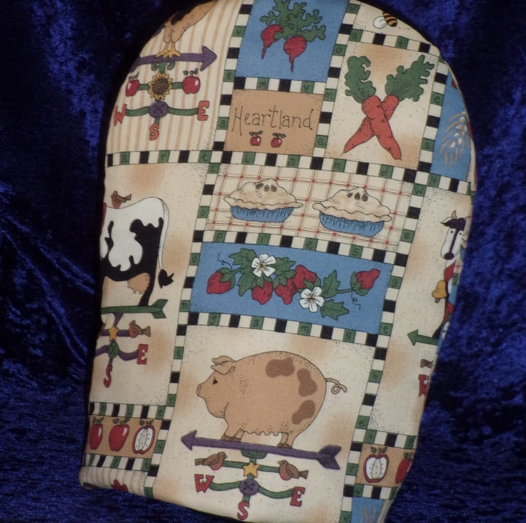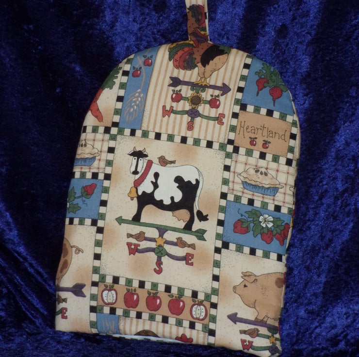 The design is of Weather Vanes with cockerels, cows and pigs, along with fruit and vegetables and fruit pies on a patchwork style fabric in beige and blue.