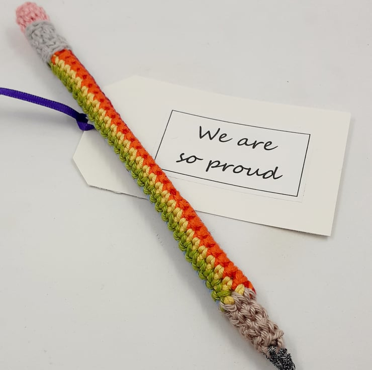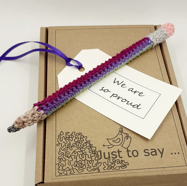 A novelty gift and congratulations message in one! This pencil is crocheted in cotton around a lolly stick and the point has been embroidered in metallic thread. It is teamed with a tag bearing the message 'We are so proud.' The pencil measures approximately 18.5 cm in length and it and the tag come wrapped in tissue in a labelled PIP ( Postage in Proportion ) box all ready to be gifted.