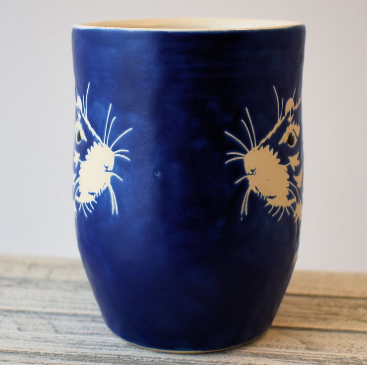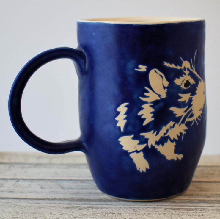 A mug thrown on the wheel, standing approximately 11.5cm tall. It is decorated with a pet rat design on each side, stencilled into a mid blue glaze to leave the image in the natural colour of the clay.