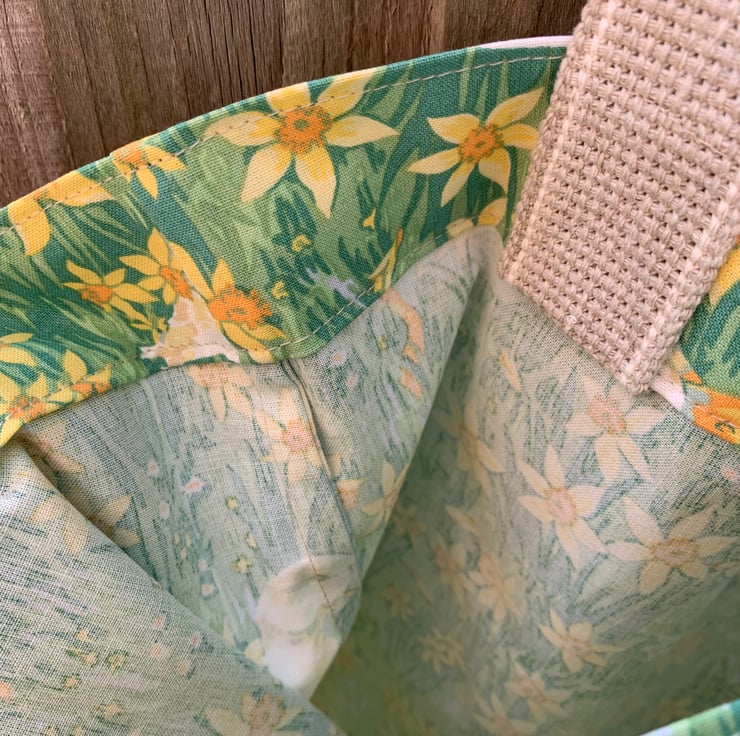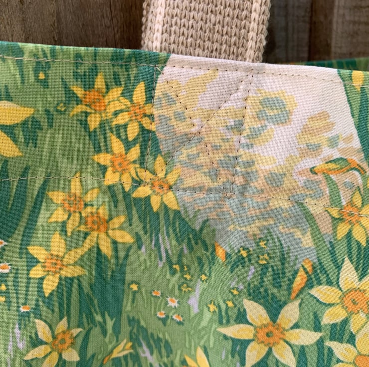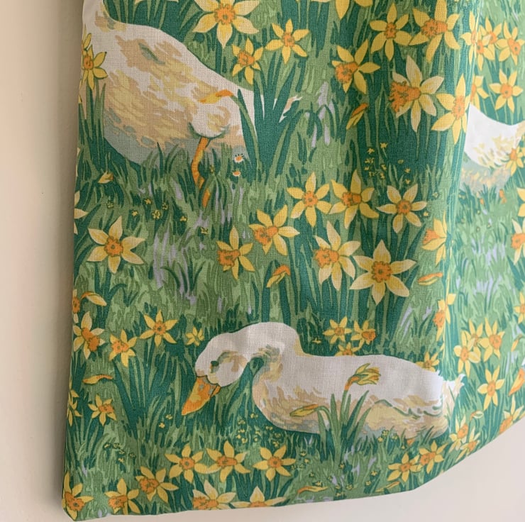 Tote bag made from vintage 1994 Laura Ashley cotton with pretty geese and daffodils print. The bag has long beige webbing straps which can be worn on the shoulder.
