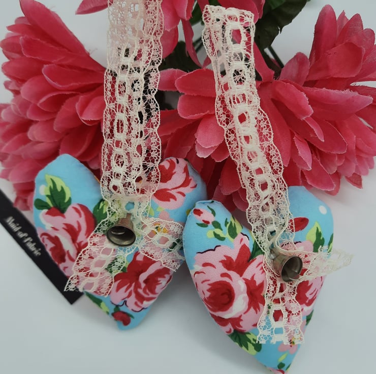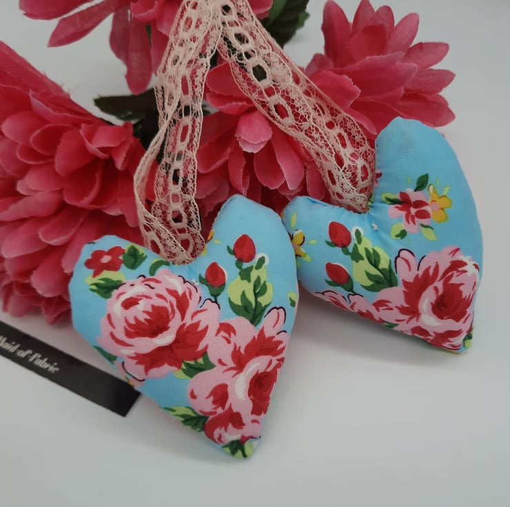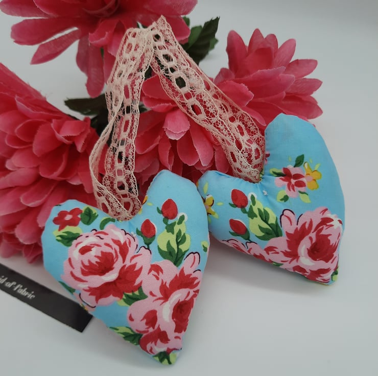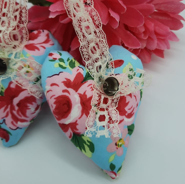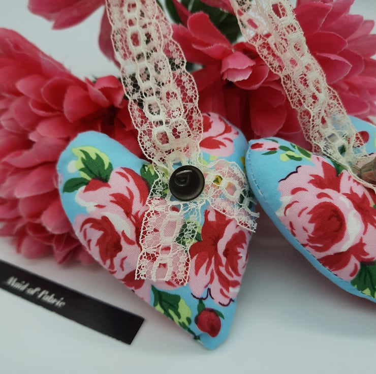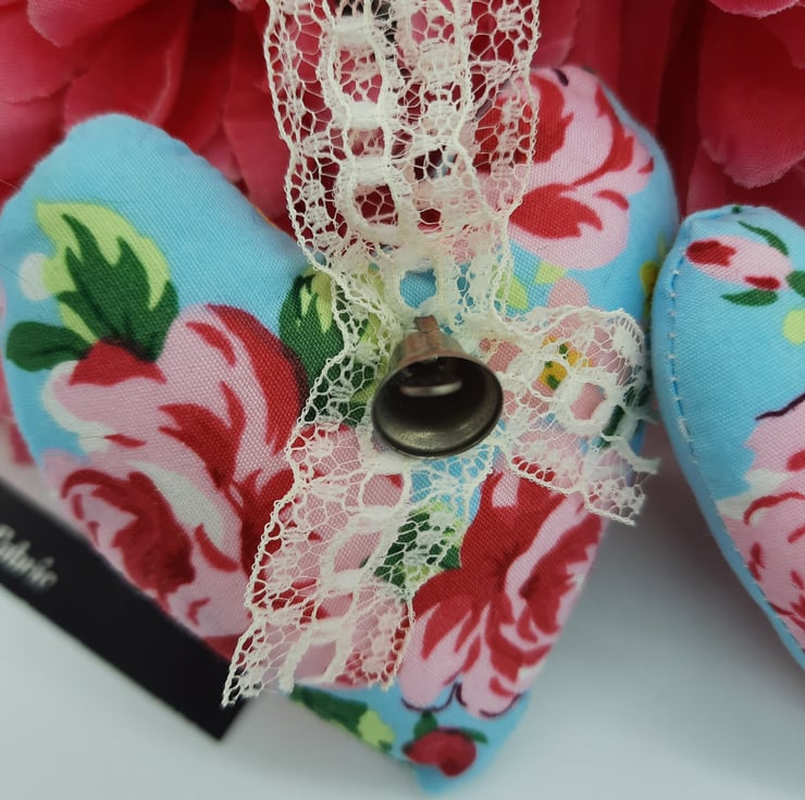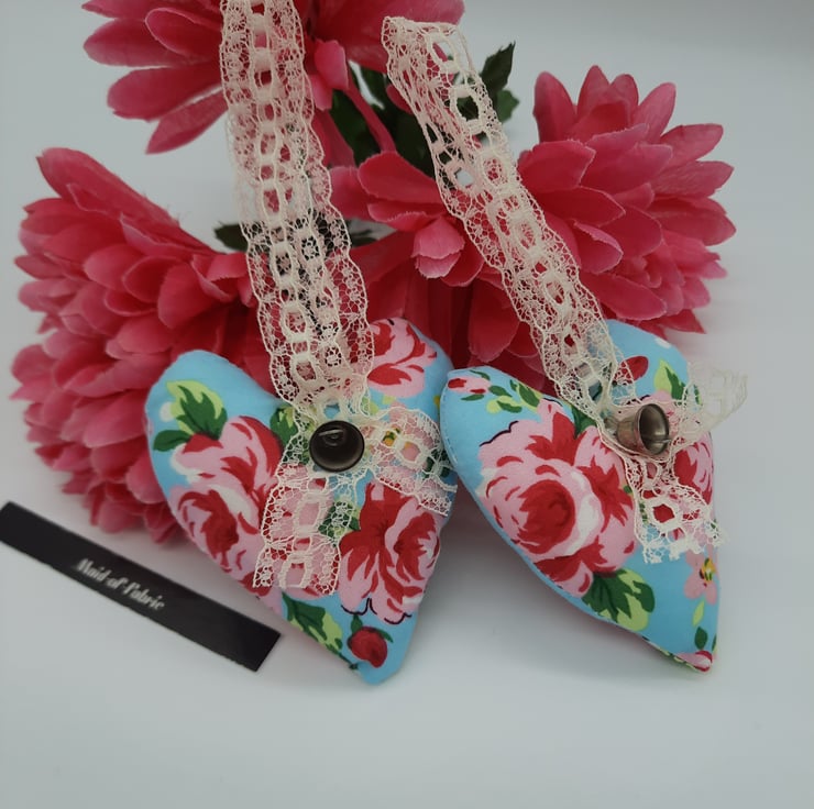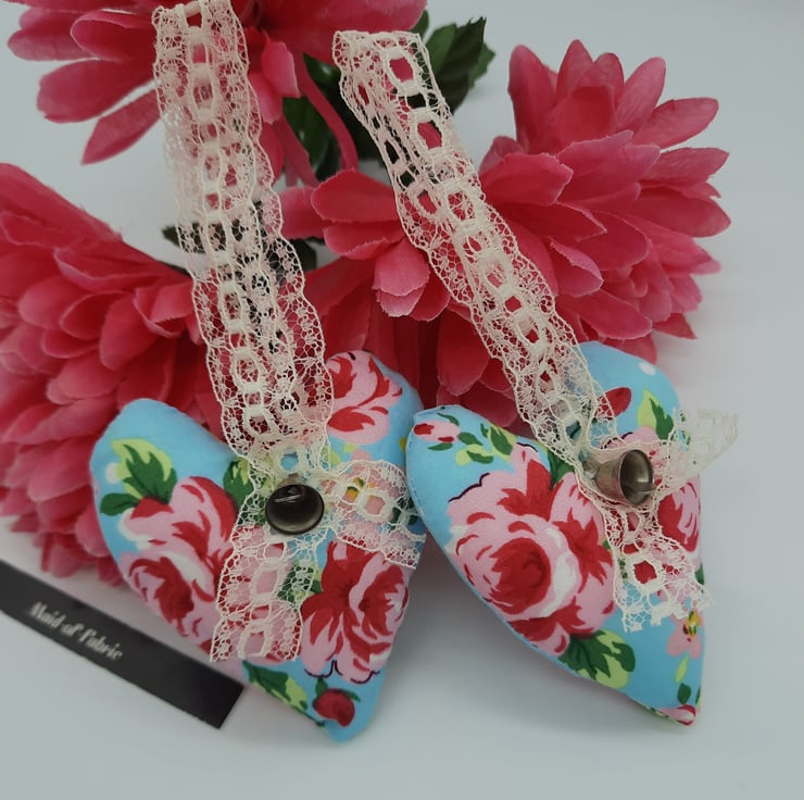 Heart hanger pair made using a blue floral cotton fabric, cream lace, silver bells and filled with synthetic stuffing.