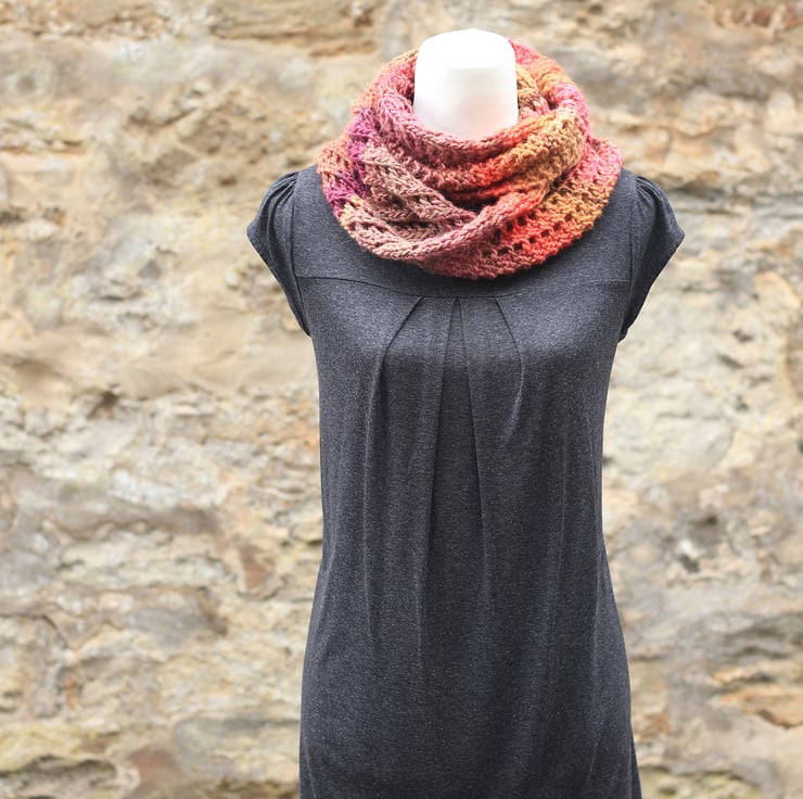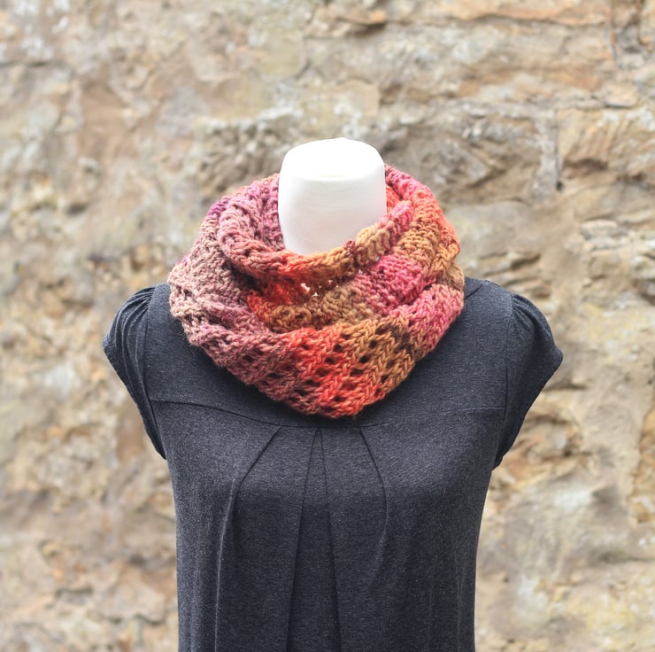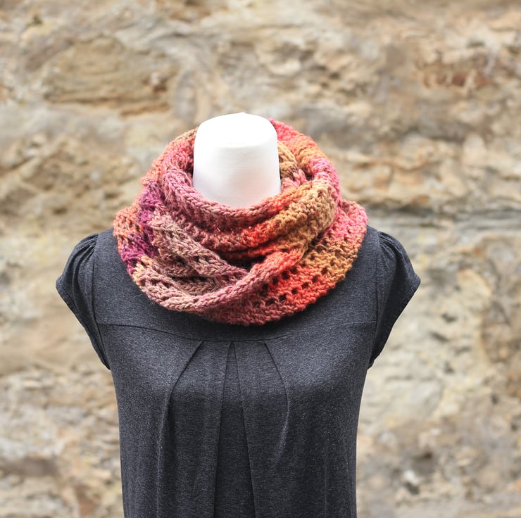 This colorful infinity scarf is hand knit out of super-soft yarn.