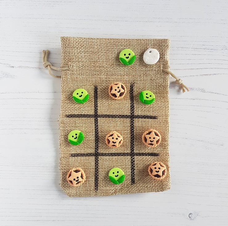 This set is with some cute smiley mince pie pieces, and some happy green Brussel sprout pieces. Individually hand made using polymer clay.