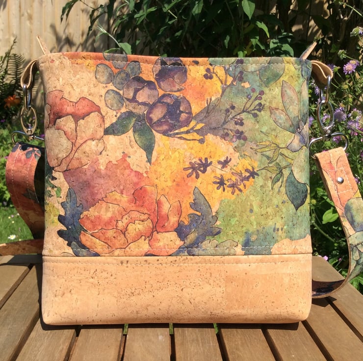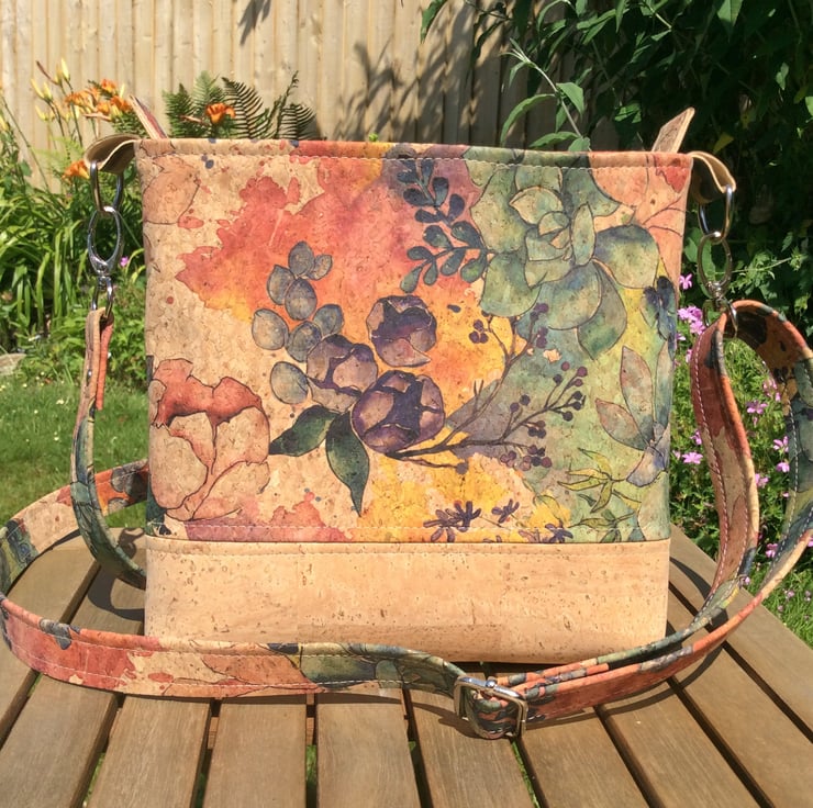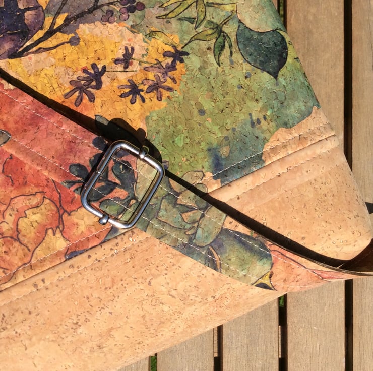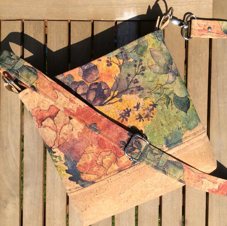 This bag is handmade from my own design using cork fabric and is fully lined with cotton fabric. It has a zip closure and an inner zip pocket. The generous strap is adjustable allowing the bag to be worn as a cross body or shoulder bag.