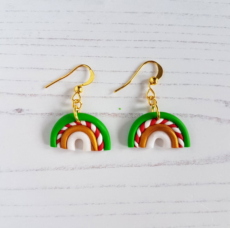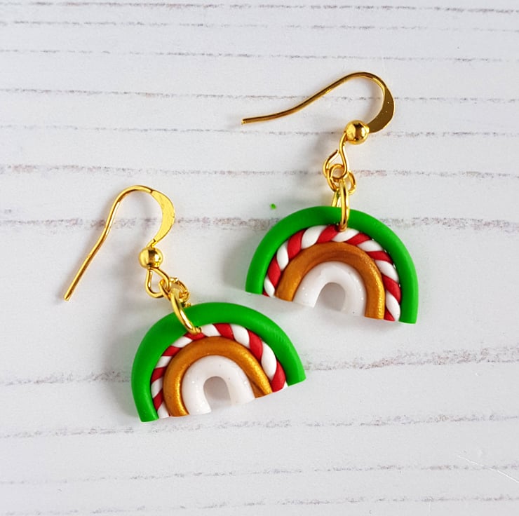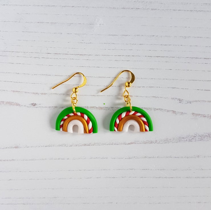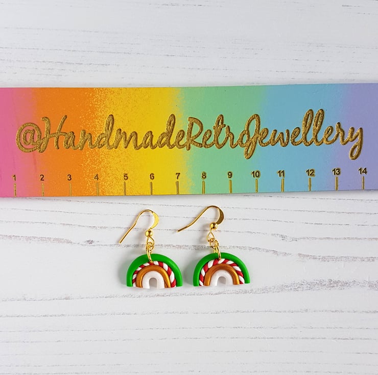 These gorgeous rainbow earrings have been carefully hand crafted using Christmas colours polymer clay, with rows of green, gold and glitter white, along with a red and white twisted row similar to my candy canes!!