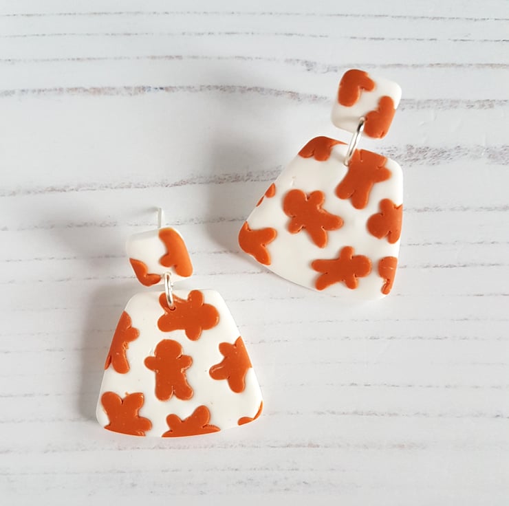These bold and unique earrings have been carefully hand crafted using polymer clay, starting with a white flat layer of clay, then tiny gingerbread men carefully placed all over the white to create a 'slab'. This has then been cut into shape and edges have been sanded for a smooth finish.