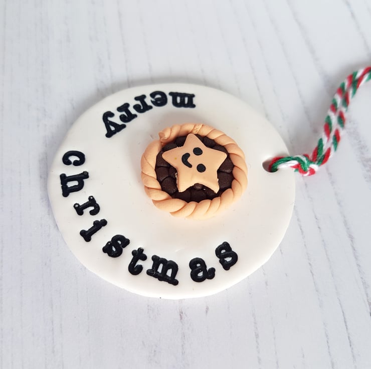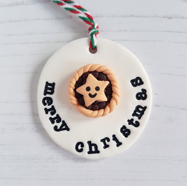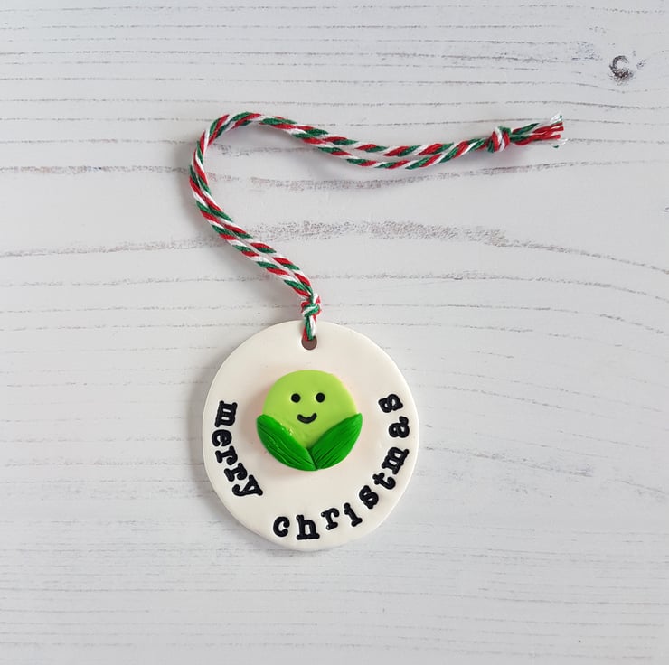This quirky decoration is hand made by myself using polymer clay, featuring your choice of a cute smiley mince pie or a green happy Brussel Sprout in the centre. The phrase "Merry Christmas" is hand stamped with individual letters along the bottom of the clay circle, then carefully hand painted using black paint for extra definition.