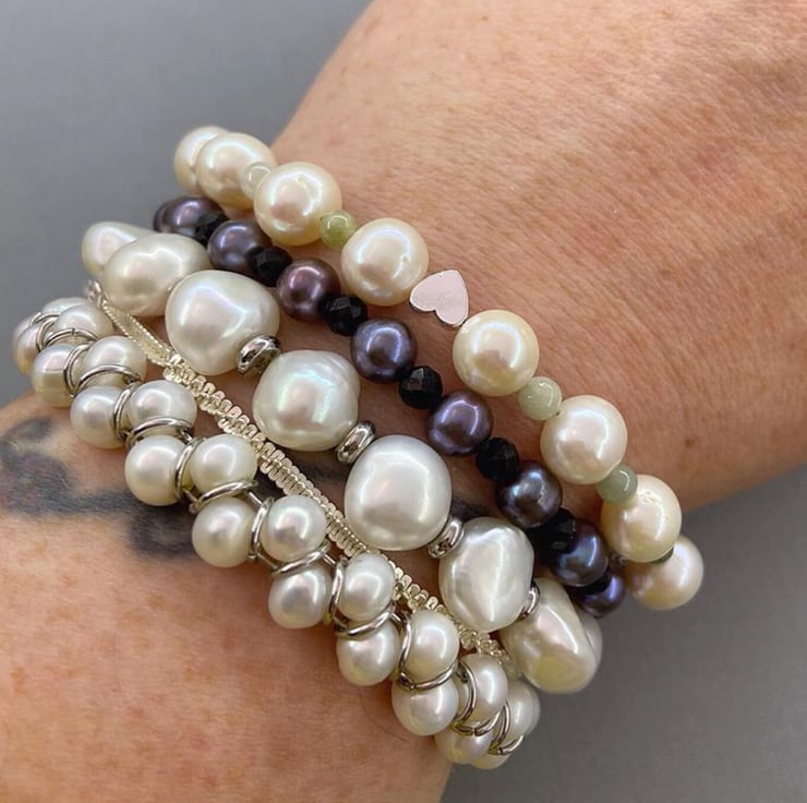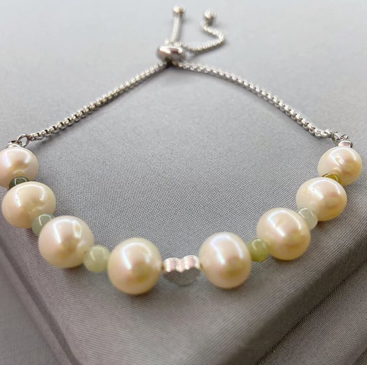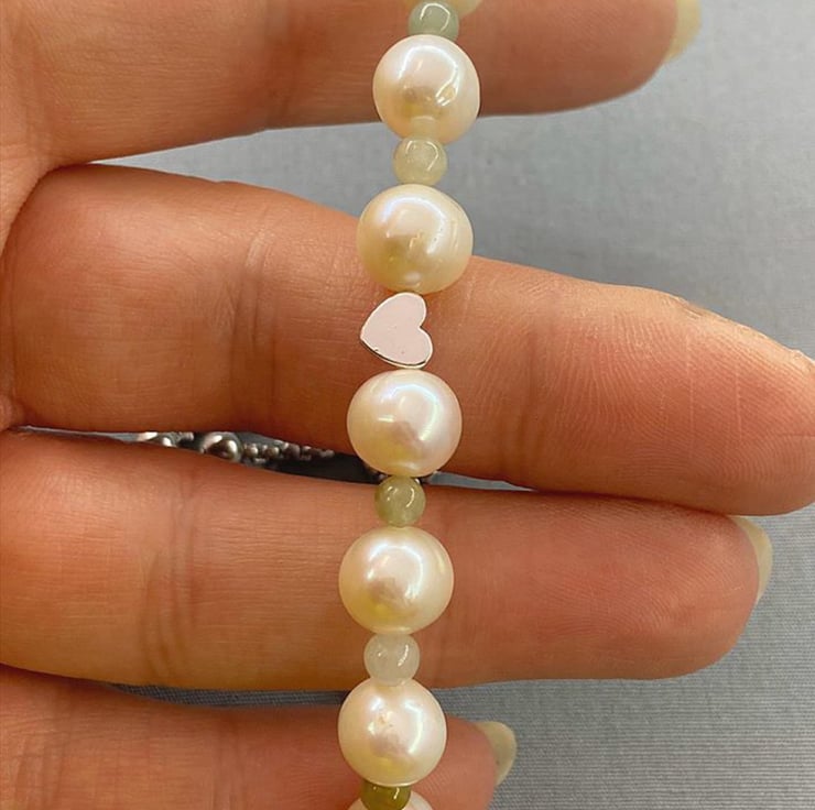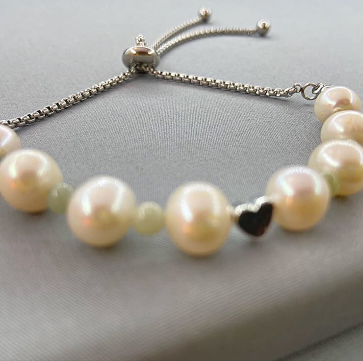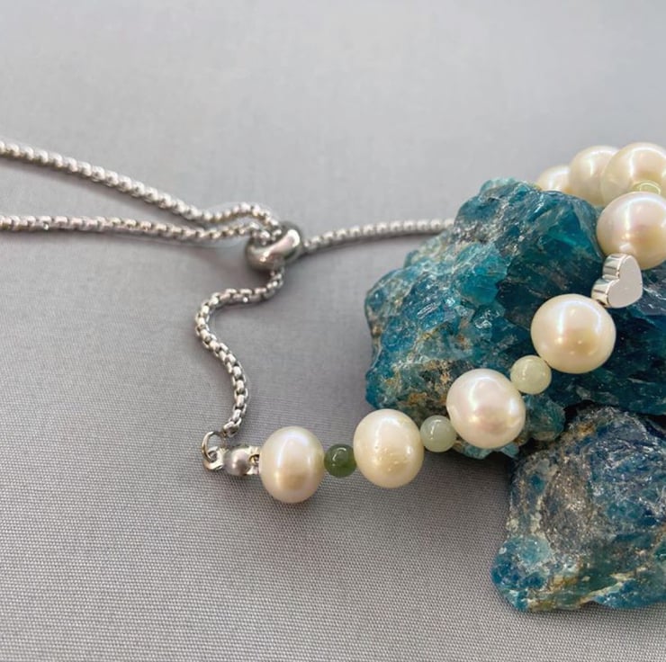 A beautiful dainty easy to wear bracelet featuring ivory near round cultured Pearls with accenting Jadeite gems with a little silver hematite heart at the centre of the bracelet. The slider bracelet itself is made of stainless steel so it will never tarnish and a very strong metal.