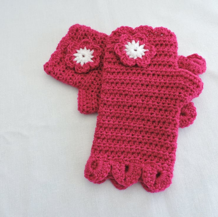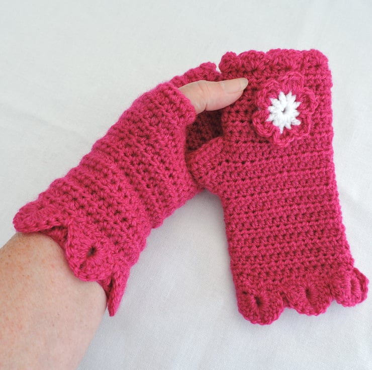 Clearance sale now £5.00 These fingerless mittens with dragon scale cuffs have been crocheted with a cerise pink 100% premium acrylic double knit yarn. A single row of dragon scales at the cuffs, a plain body, a wavy edge to the top and finished with a white and cerise pink crochet flower at the top of each mitten. The perfect winter warmer.