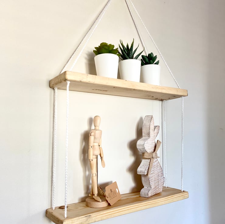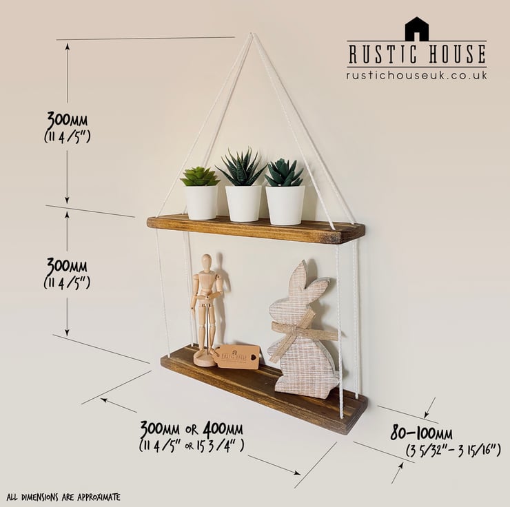 Choose either 300mm or 400mm wide shelves, they hang at approx. 600mm from the top point of the cord to the bottom shelf with approx. 300mm between each shelf. The shelves can vary in depth anywhere between 80mm (3 5/32") to 100mm (3 15/16").