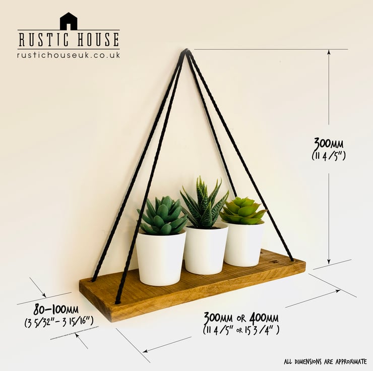 Choose either 300mm or 400mm wide shelves, they hang at approx. 300mm from the top point of the cord to the bottom shelf. The shelves can vary in depth anywhere between 80mm (3 5/32") to 100mm (3 15/16").
